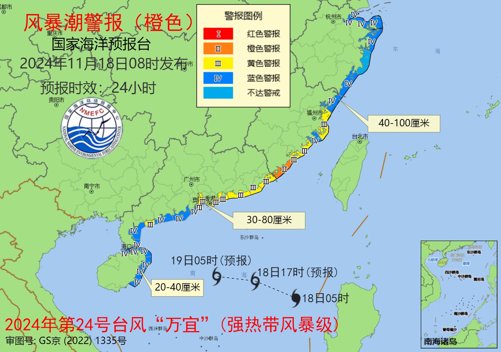 风暴潮方面,预计18日上午至19日上午,杭州湾至福建漳州沿海将出现40到100厘米的风暴增水,广东潮州至雷州半岛东岸沿海将出现30到80厘米的风暴增水,海南岛北部和东部沿海将出现20到40厘米的风暴增水。福建省漳州市的风暴潮预警级别为橙色;福建省福州市、泉州市、厦门市,广东省汕头市、汕尾市、惠州市、深圳市、广州市、中山市、珠海市和茂名市的风暴潮预警级别为黄色;浙江省嘉兴市、绍兴市、宁波市、舟山市、温州市,福建省宁德市、莆田市,广东省江门市、阳江市、湛江市,海南省海口市、文昌市和琼海市的风暴潮预警级别为蓝色。