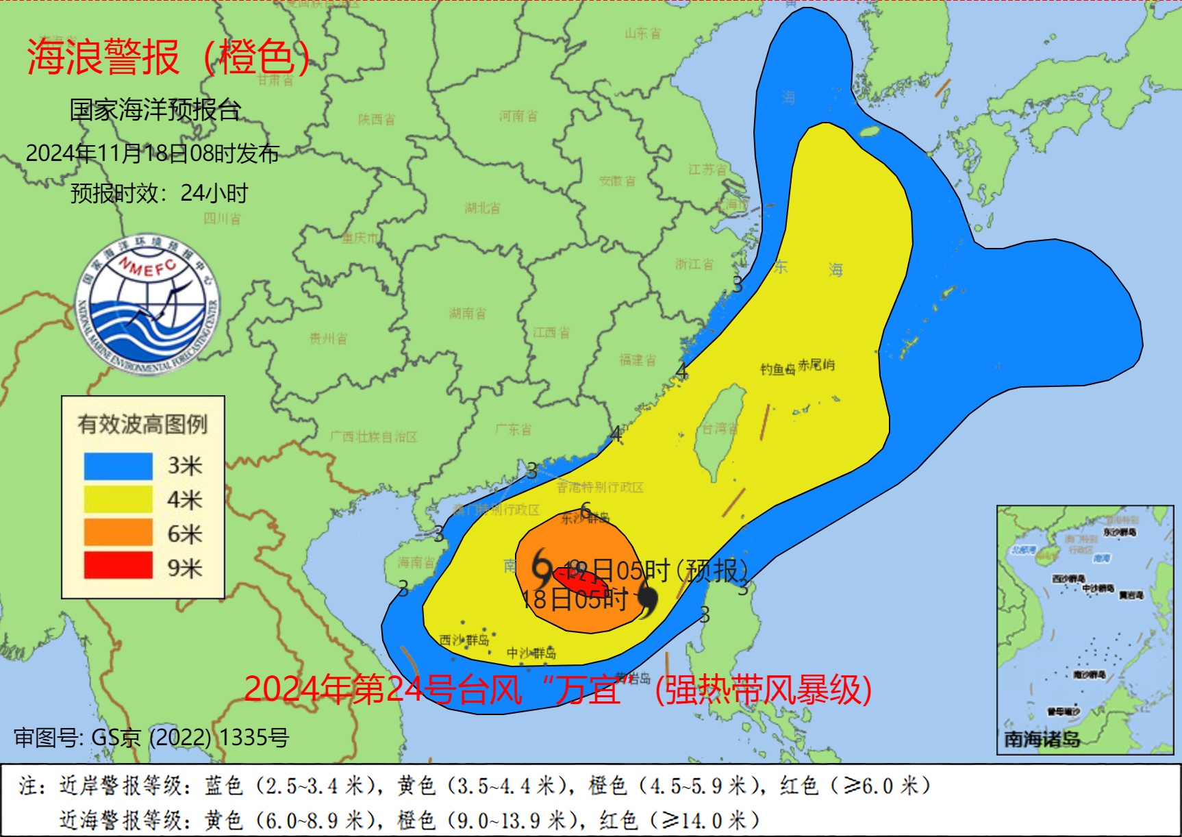 海浪方面,预计11月18日中午到19日中午,南海北部将出现6到9米的狂浪到狂涛区,台湾海峡将出现4到6米的巨浪到狂浪区,黄海南部、东海将出现3到5.5米的大浪到巨浪区,近海海域海浪预警级别为橙色;福建近岸海域将出现3到4.5米的大浪到巨浪,该近岸海域海浪预警级别为橙色,广东东部、海南东部近岸海域将出现2.5到4米的大浪到巨浪,该近岸海域海浪预警级别为黄色,江苏南部、上海、浙江近岸海域将出现2到3.4米的中浪到大浪,该近岸海域海浪预警级别为蓝色。