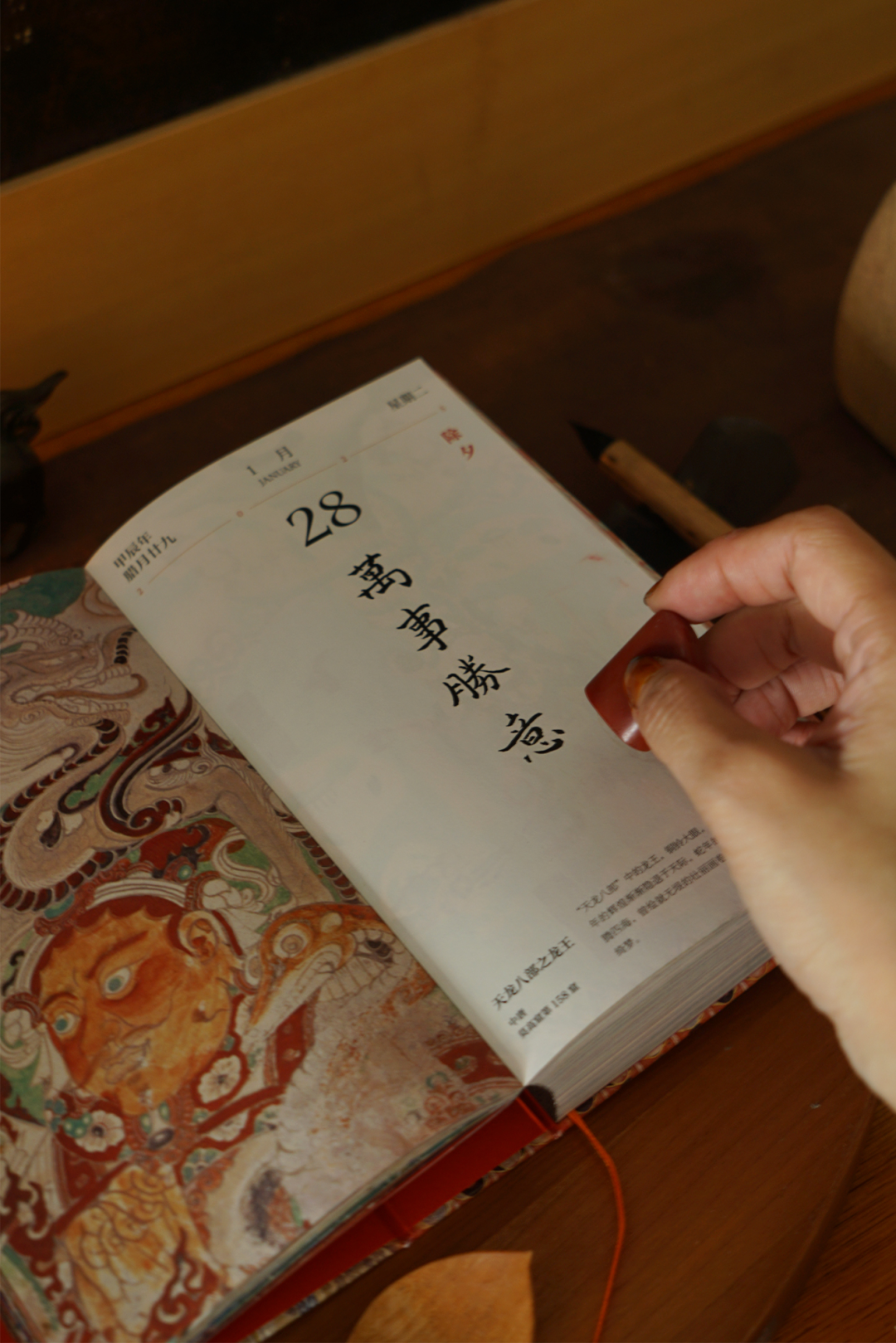 日历采用每日一图的形式,左页欣赏纤毫毕现的敦煌艺术,右页标注日期、节日,下方配以解读文字,图文结合,既是历史与文化知识的补充,也是艺术与美的陶冶。由“中国最美的书”获奖设计师操刀整体设计,封面特别选用被誉为“最美菩萨”的敦煌壁画中的观音像,端庄慈悲,目光温柔,福泽静洒人间。