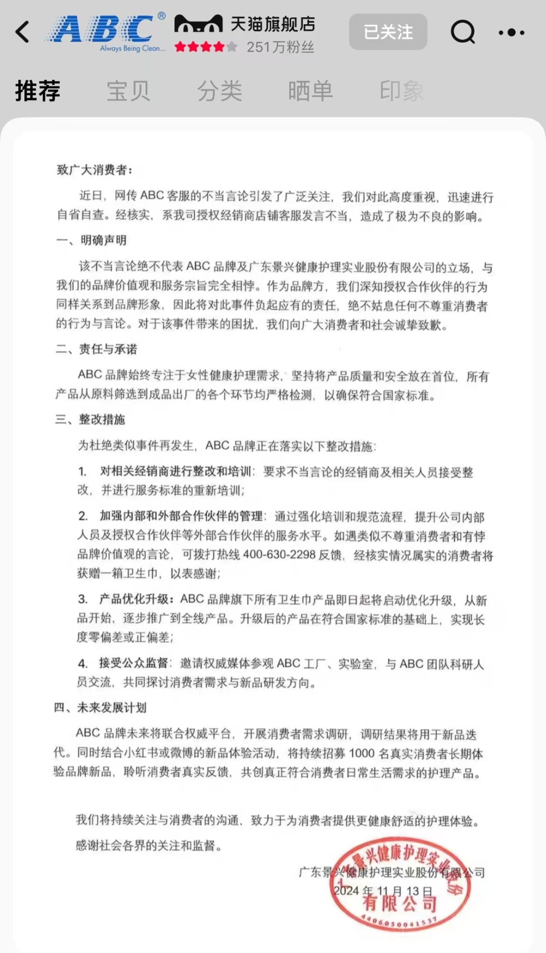 11月18日,记者浏览ABC天猫旗舰店发现,首页最醒目位置张贴着《致广大消费者》的相关声明,ABC表示整改内容包括“所有卫生巾即日起启动优化升级,升级后的产品在符合国家标准的基础上,实现长度零偏差或正偏差”。