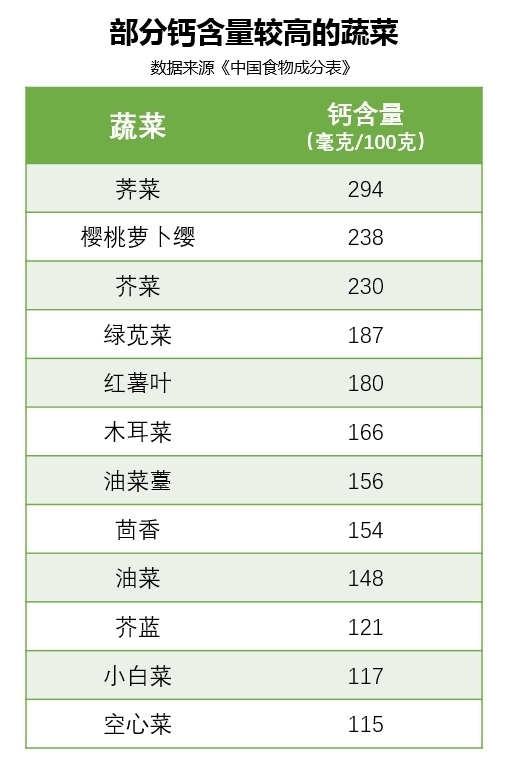 据《中国食物成分表》,许多常见绿叶蔬菜的钙含量在100毫克/100克左右,与牛奶的钙含量相旗鼓相当,有些甚至比牛奶高出不少。