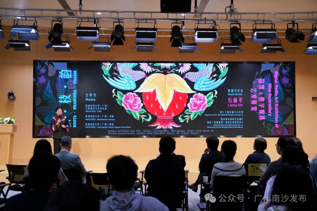 11月19日,由香港科技大学(广州)信息枢纽计算媒体与艺术(CMA)学域主办、书院及团委协办的“根·枝·韵”苗绣数字媒体艺术展举行开幕仪式。