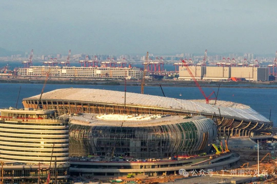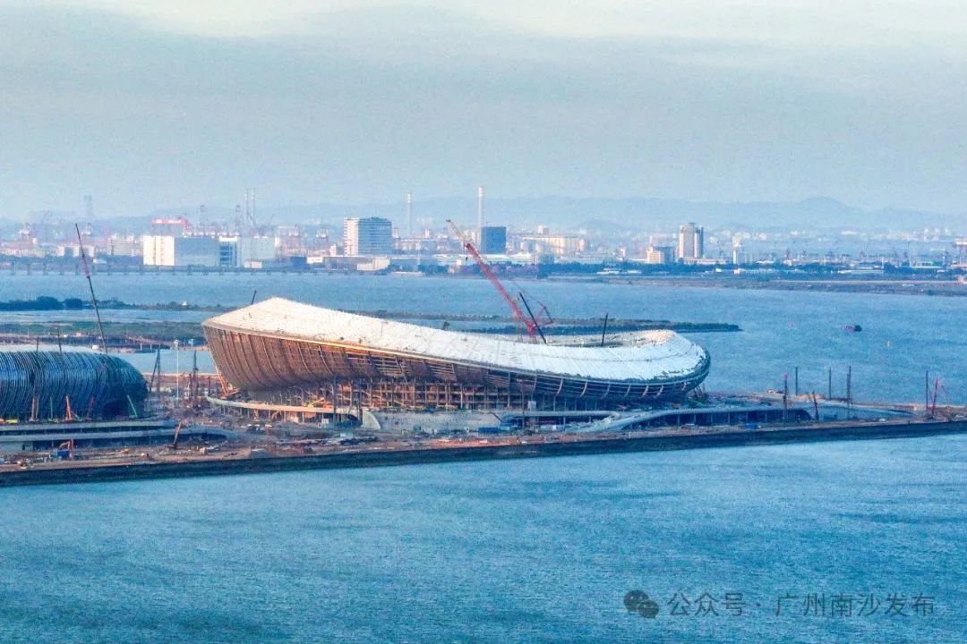 据介绍,南沙全民文化体育综合体坐落于南沙区二十一涌海边,仅有19个月建设周期。该项目自2023年8月31日开工,仅用90天完成桩基施工、90天完成主体结构施工、100天完成钢结构施工,创造了大型文体场馆主体施工的国内最快纪录。