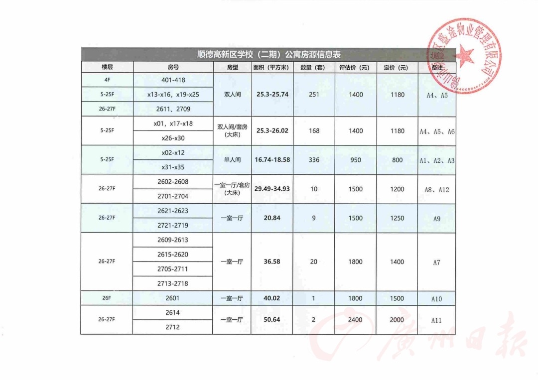 据了解,顺德高新区学校(二期)公寓项目位于顺德区杏坛镇德富路33号。该项目房源信息表显示,总房源为797套。