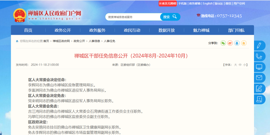 11月18日晚,佛山市禅城区政府网发布最新一期禅城区干部任免信息(2024年8月-2024年10月),涉及多个局长、副局长等20多个职位的调整。