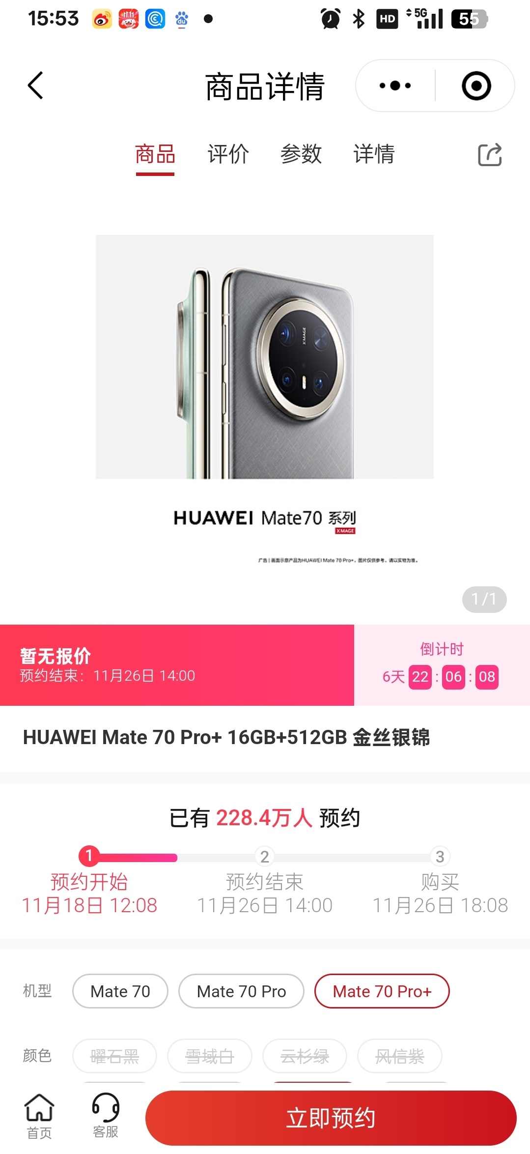 11月18日12时8分,华为Mate 70系列正式开启预订。华为官方商城显示,开启后5分钟之内,已有超27万人预约。截至今日下午15:53,预订量已突破228万人。