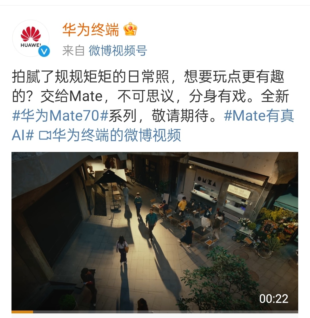 今日上午,华为终端连发三个宣传视频,为Mate70系列预热。记者关注到,每一条宣传文案中均带有“Mate有真AI”的标签,Mate70系列围绕AI做文章的“中心思想”引发关注。