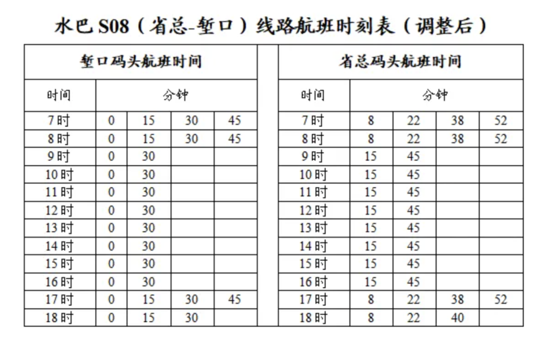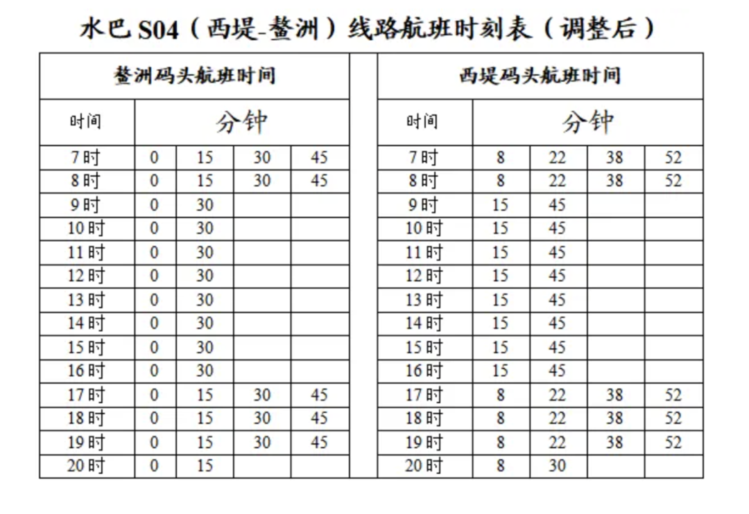 水巴S04(西堤-鳌洲)线路在鳌洲码头首班开船时间由原6:45时调整为7:00,在西堤码头首班开船时间由6:52调整为7:08;7:00-9:00、17:00-20:30航班间隔保持不变;9:00-17:00航班间隔由原15分钟/班次调整为30分钟/班次;线路航班服务及票价保持不变。