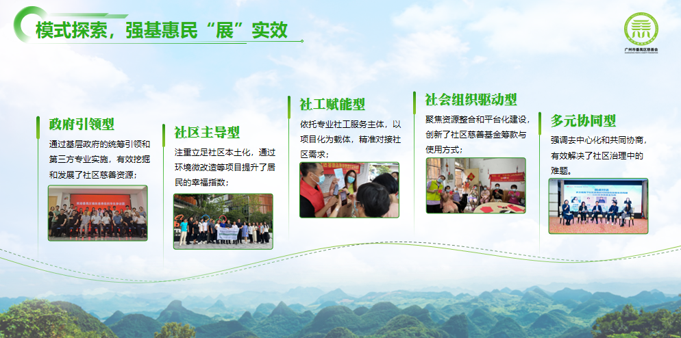 三是模式探索,强基惠民“展”实效。经过4年多的探索与实践,番禺区社区慈善基金形成了五种组织模式:政府引领型、社区主导型、社工赋能型、社会组织驱动型、多元协同型。这些模式因地制宜、各具特色,助力民生服务取得了显著成效。