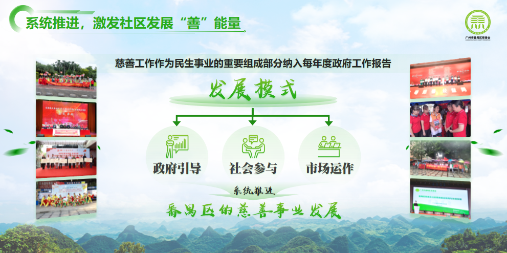 一是系统推进,激发社区发展“善”能量。番禺区委、区政府高度重视慈善工作,将慈善事业作为民生事业的重要组成部分纳入每年度政府工作报告,番禺区构建了“政府引导、社会参与、市场运作”的慈善事业发展模式,系统推进番禺区的慈善事业发展。