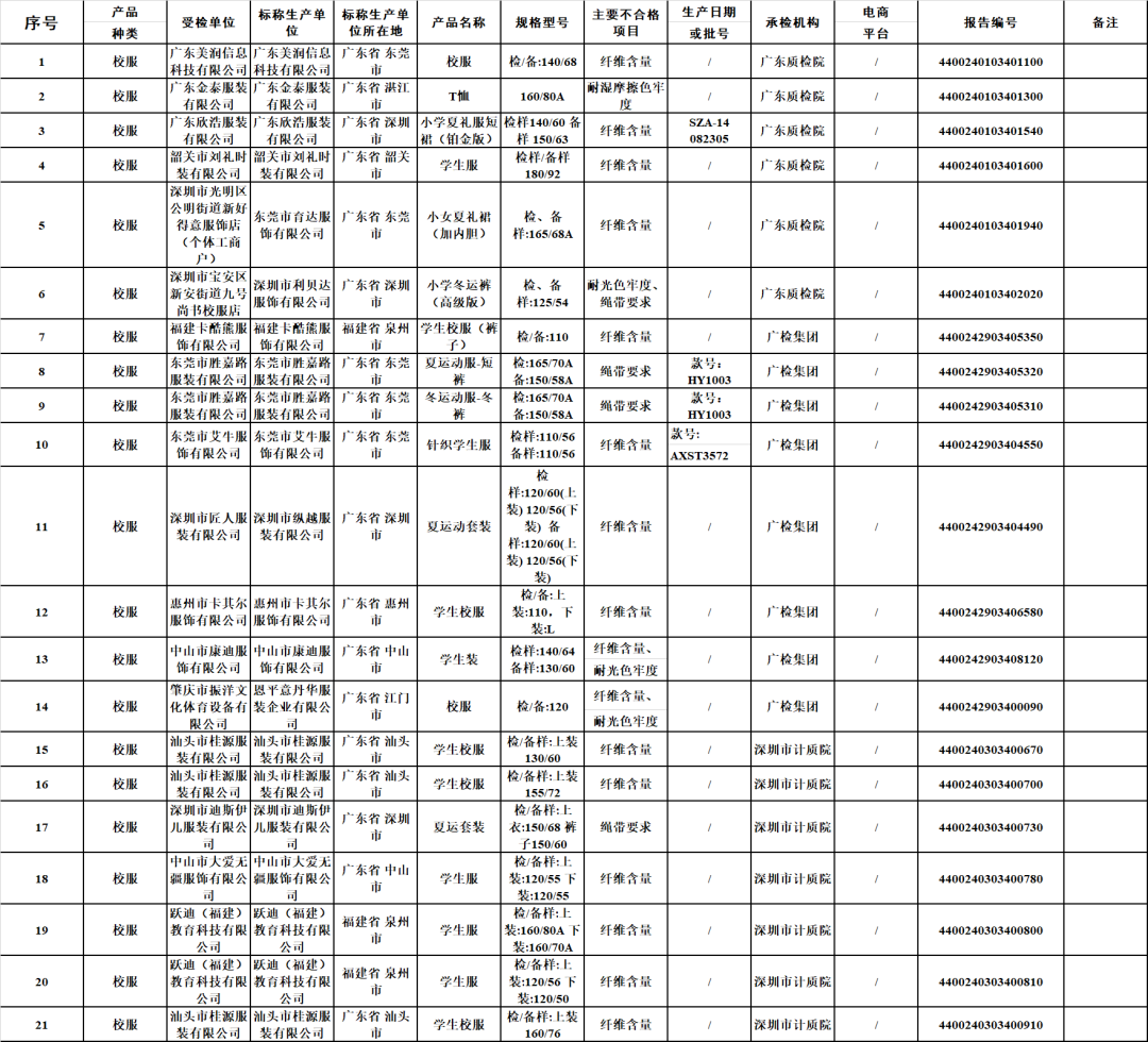 据介绍,本次抽查对象为线下销售、学校校服库存点的校服产品,共发现21款不合格,不合格项目为:耐光色牢度(级)、耐湿摩擦色牢度(级)、纤维含量(%)、绳带要求(安全标准项目)。
