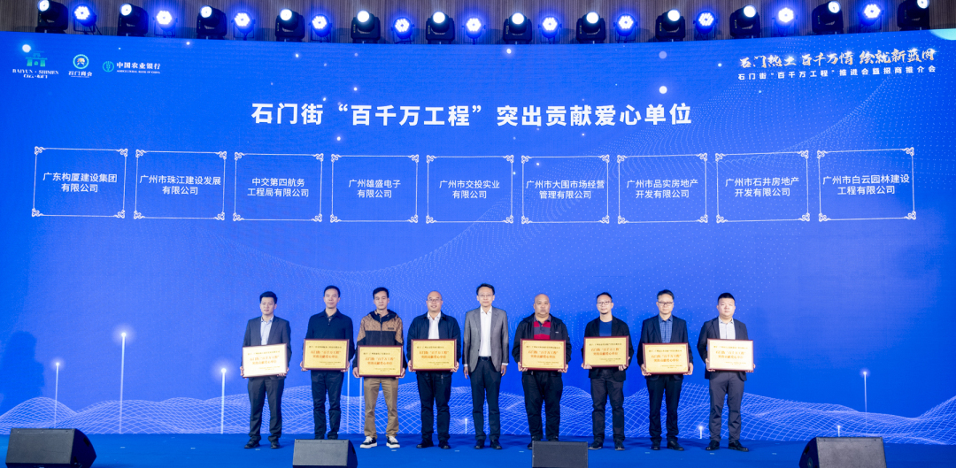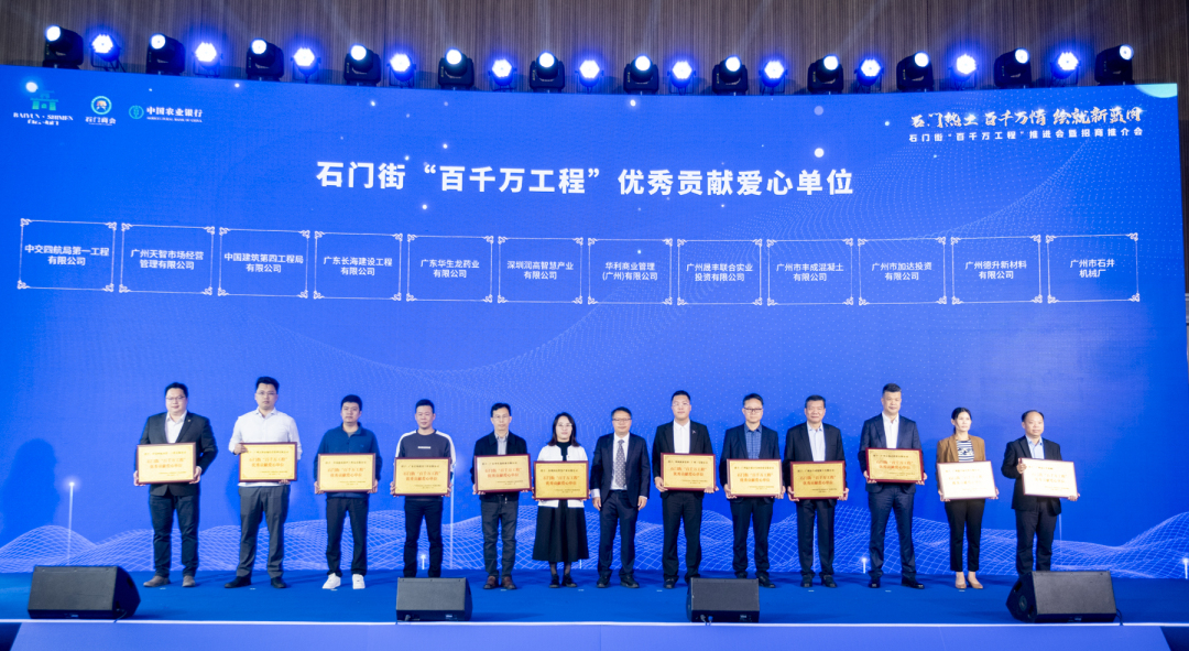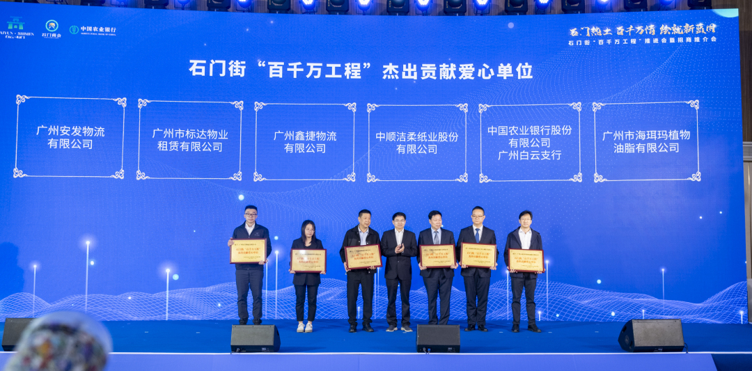 大会现场,石门街道相关负责人为中顺洁柔纸业股份有限公司、中国农业银行股份有限公司广州白云支行等五十余家单位颁发助力石门街道“百千万工程”爱心企业牌匾,以表彰他们为石门街道“百千万工程”作出的突出贡献。