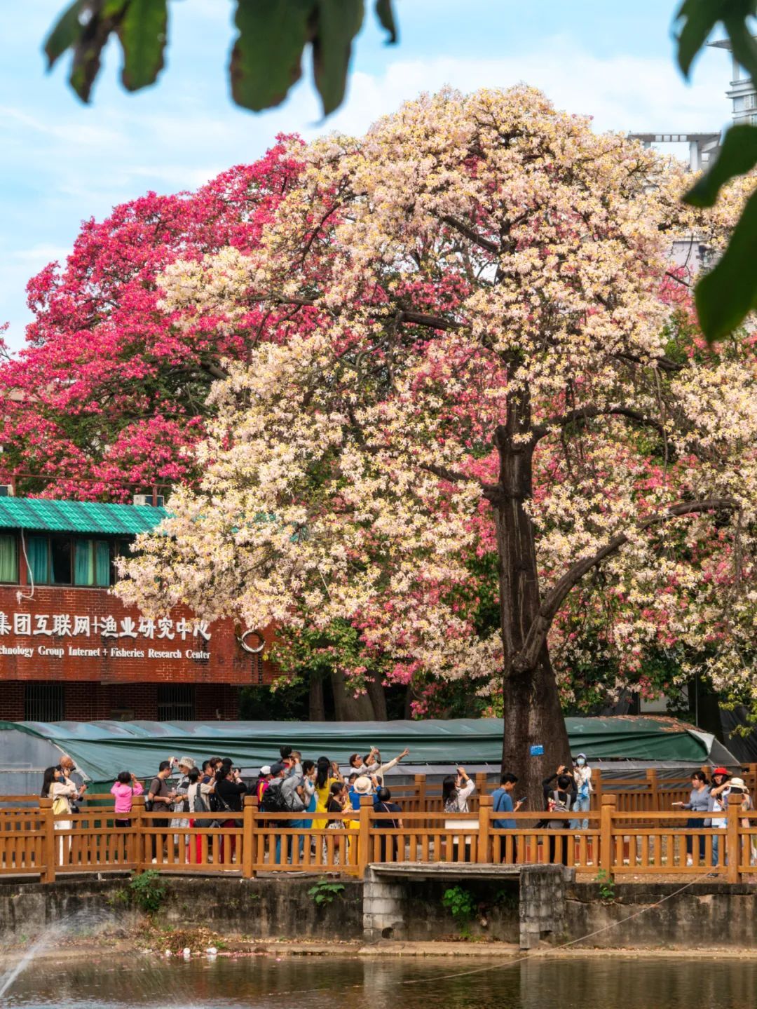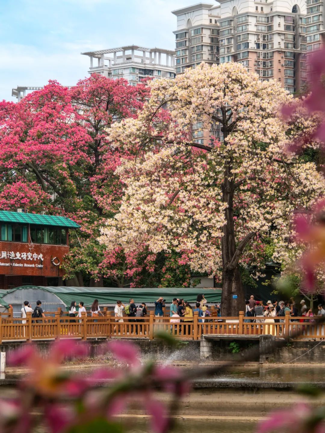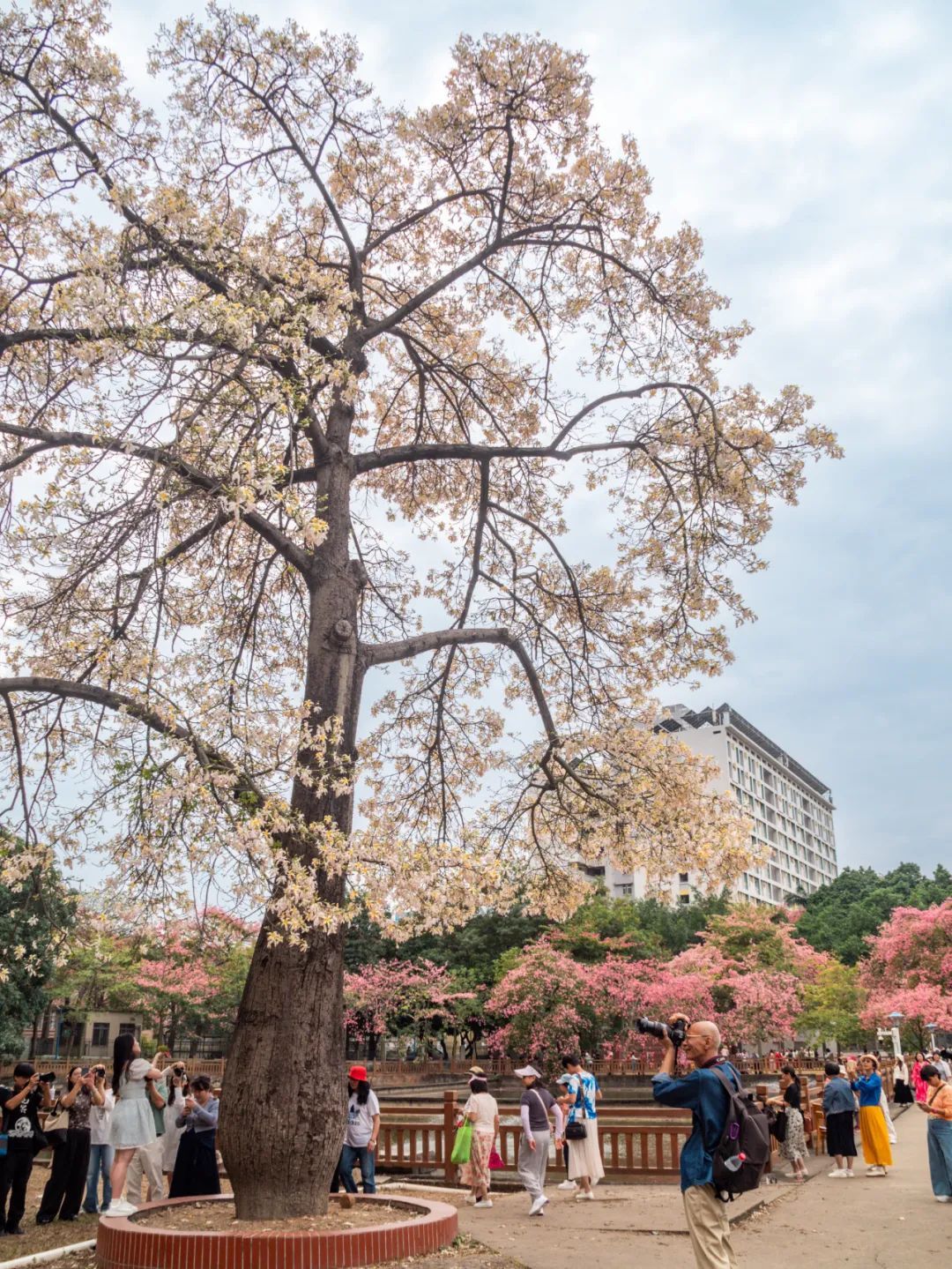 不少来艺术中心参观的游客被这棵花树吸引目光,过来拍照“打卡”。在他们的相机、手机里,异木棉的娇艳与艺术中心的独特造型完美融合。