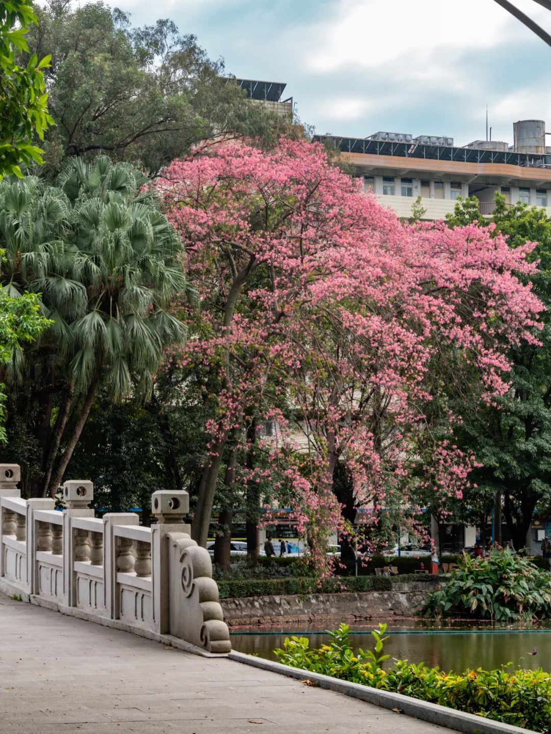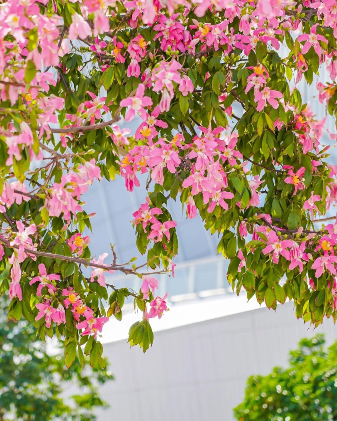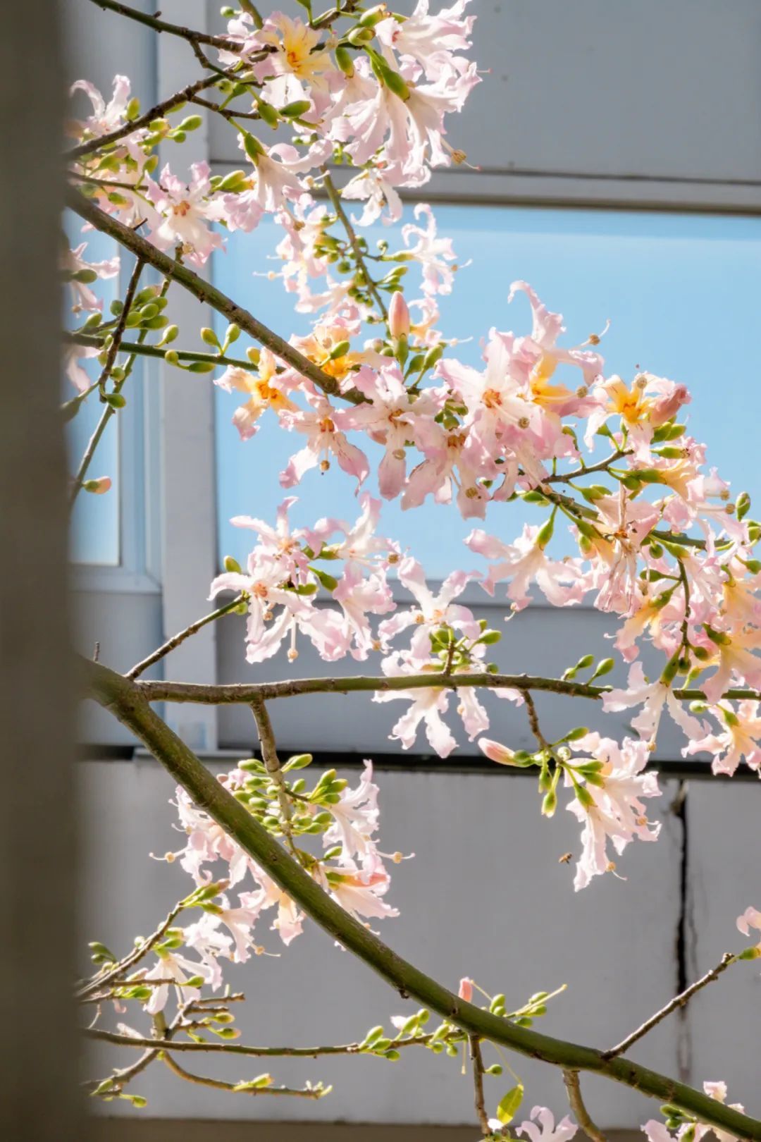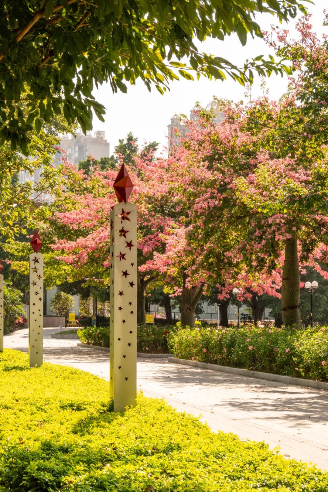 除了白色的美丽异木棉花,校园内还有很多处开粉色花的“美树”,等待你去慢慢欣赏。