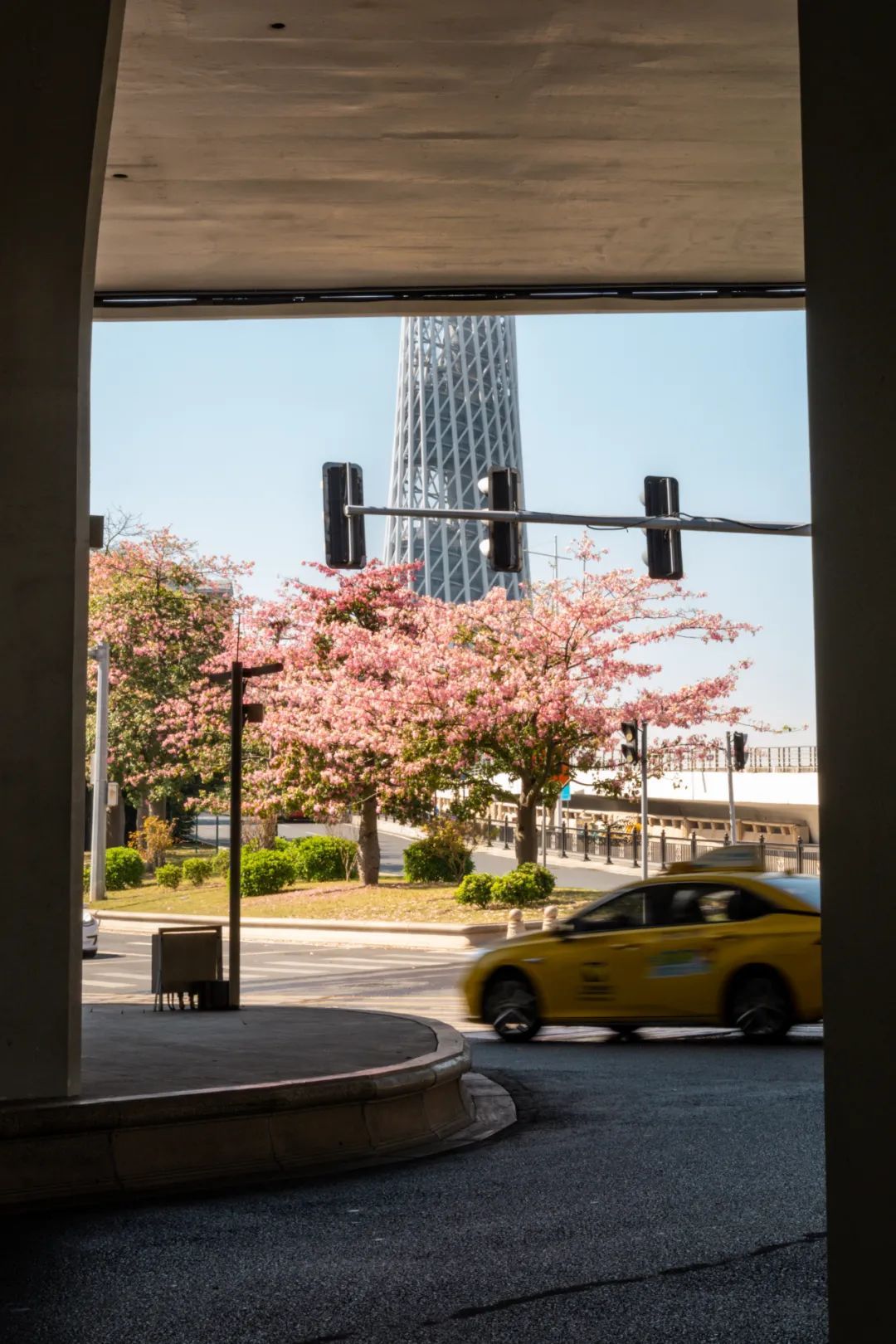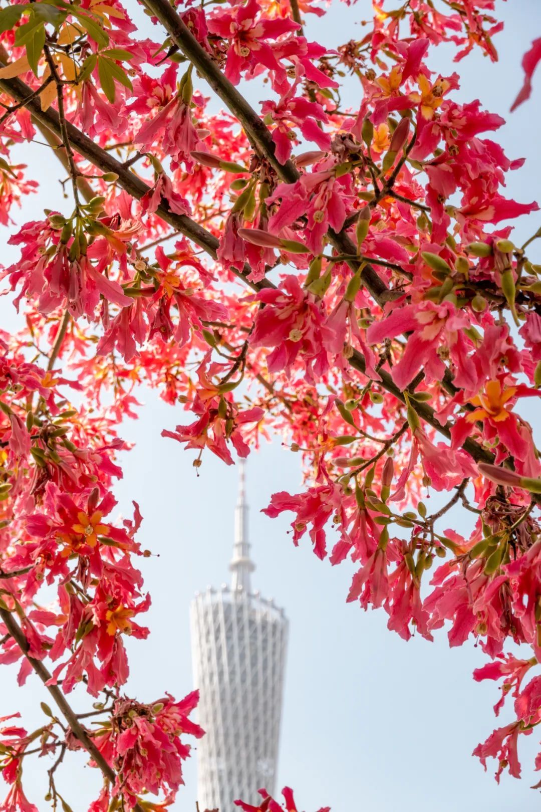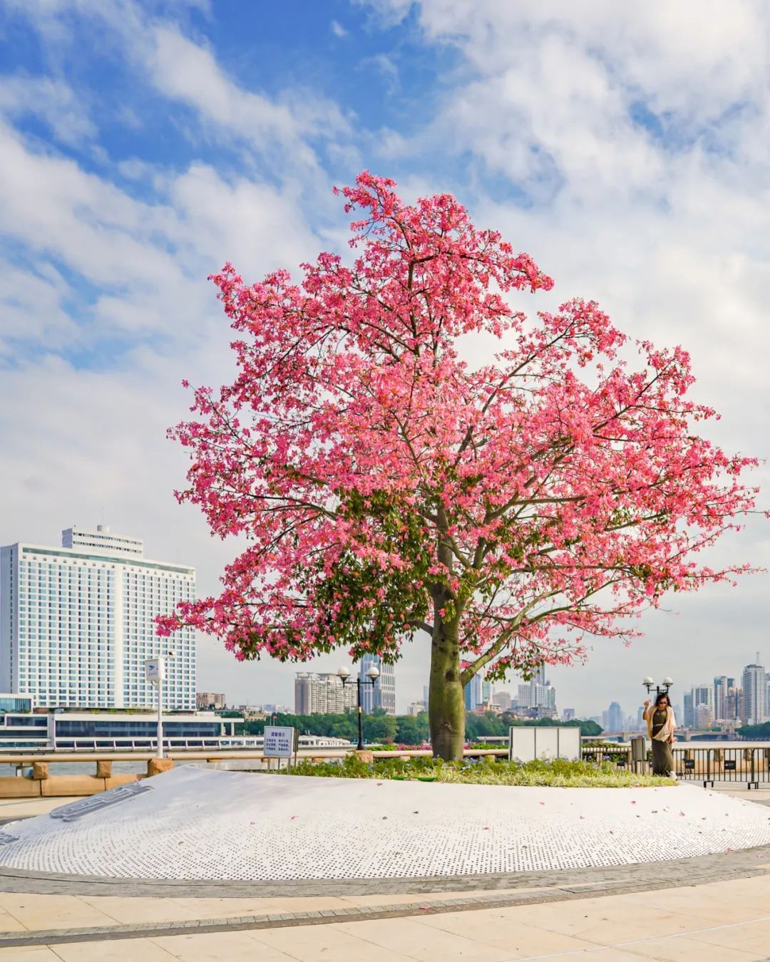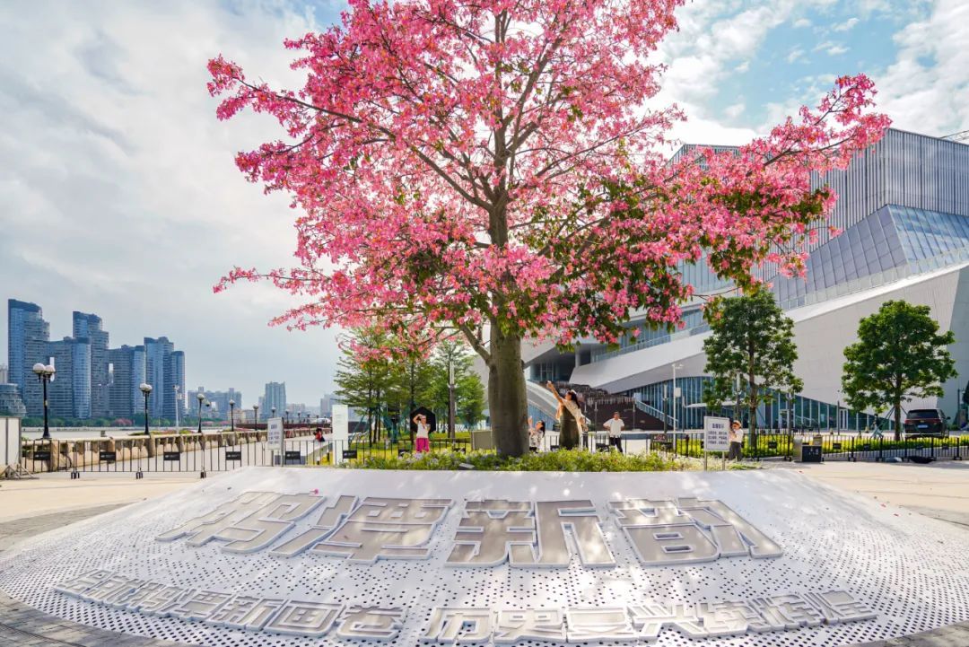 ▲在白鹅潭畔的大湾区艺术中心边上,一株粉红色的美丽异木棉亭亭玉立,满树粉红花朵,搭配上珠江两岸建筑风光,这片充满艺术气息的天地更显浪漫。(摄影|吴子良)