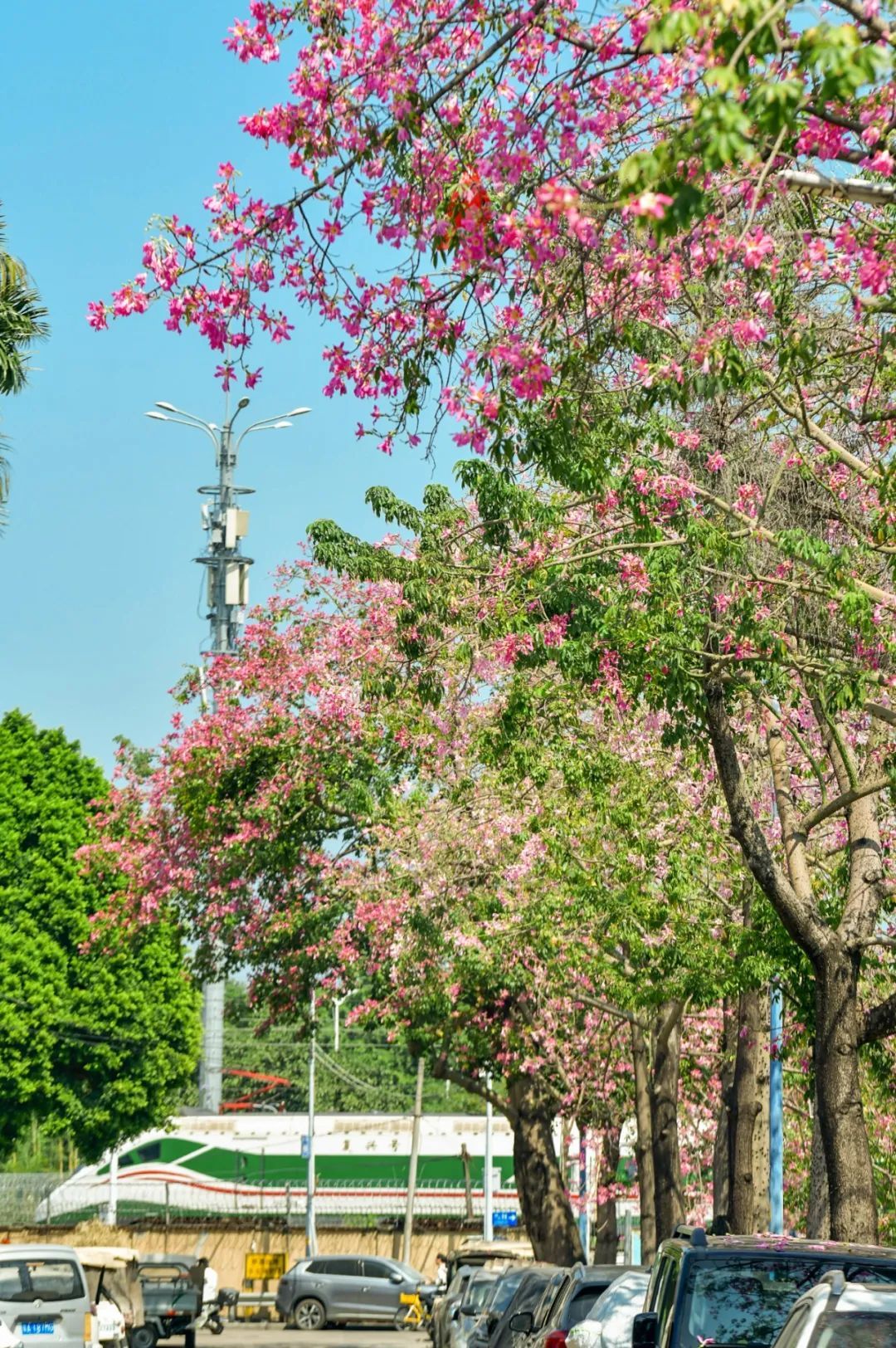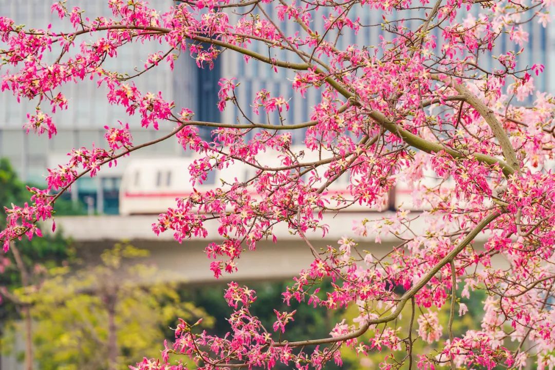 ▲广州市南沙区,美丽异木棉与列车“同框”,粉色花朵灿若云霞。(摄影|莫伟浓)