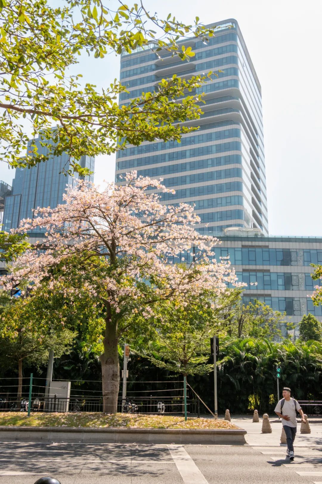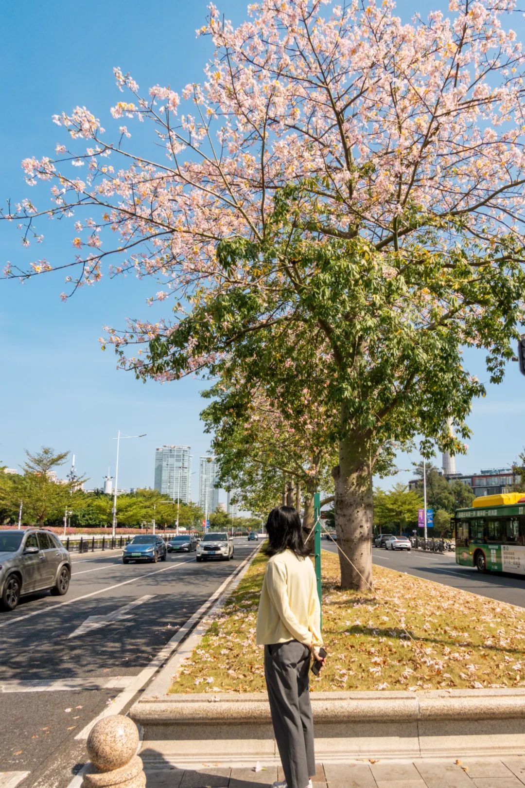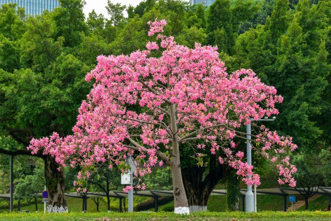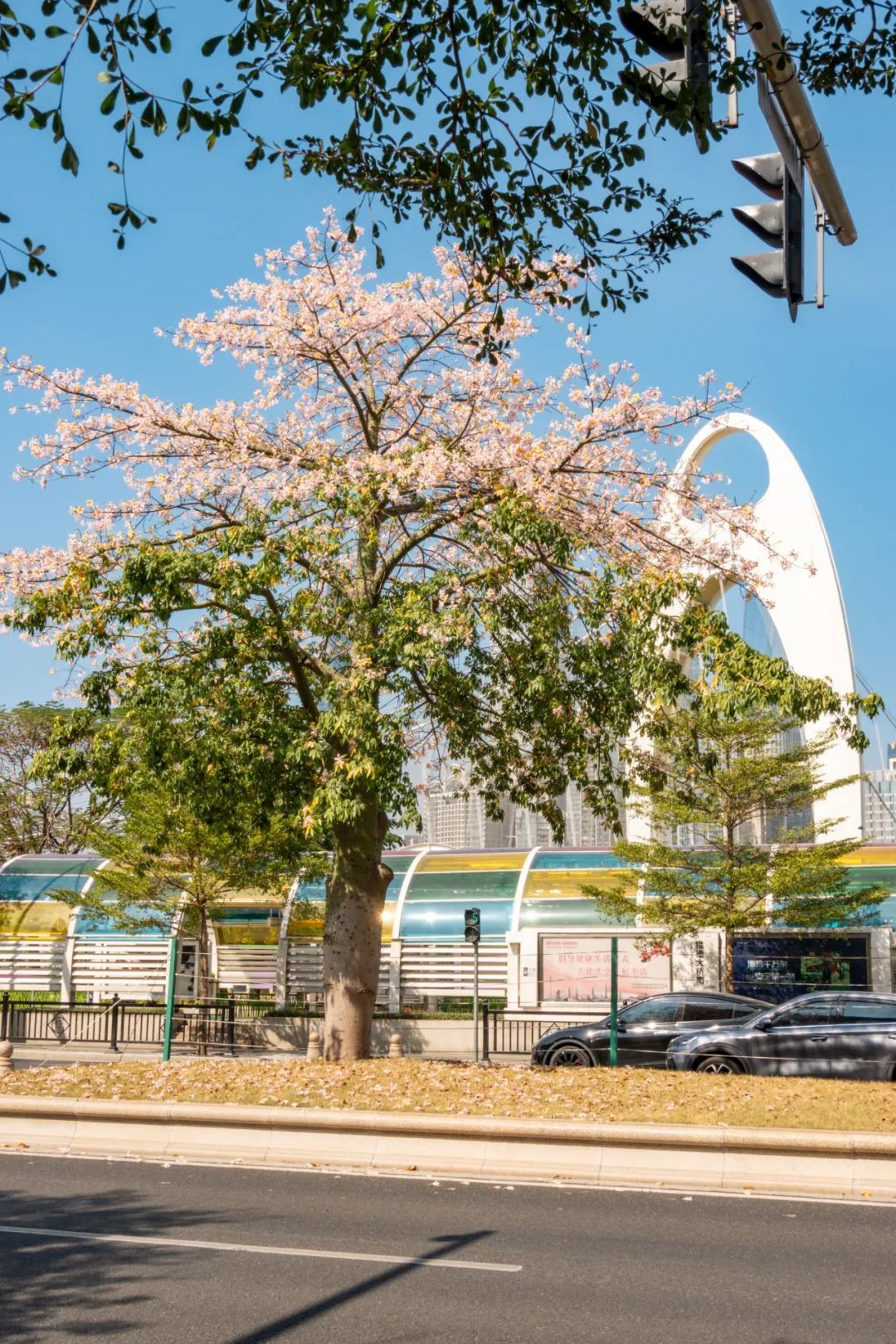 这棵美丽异木棉位于热闹的大湾区艺术中心附近,周围很开阔,非常适合观赏。