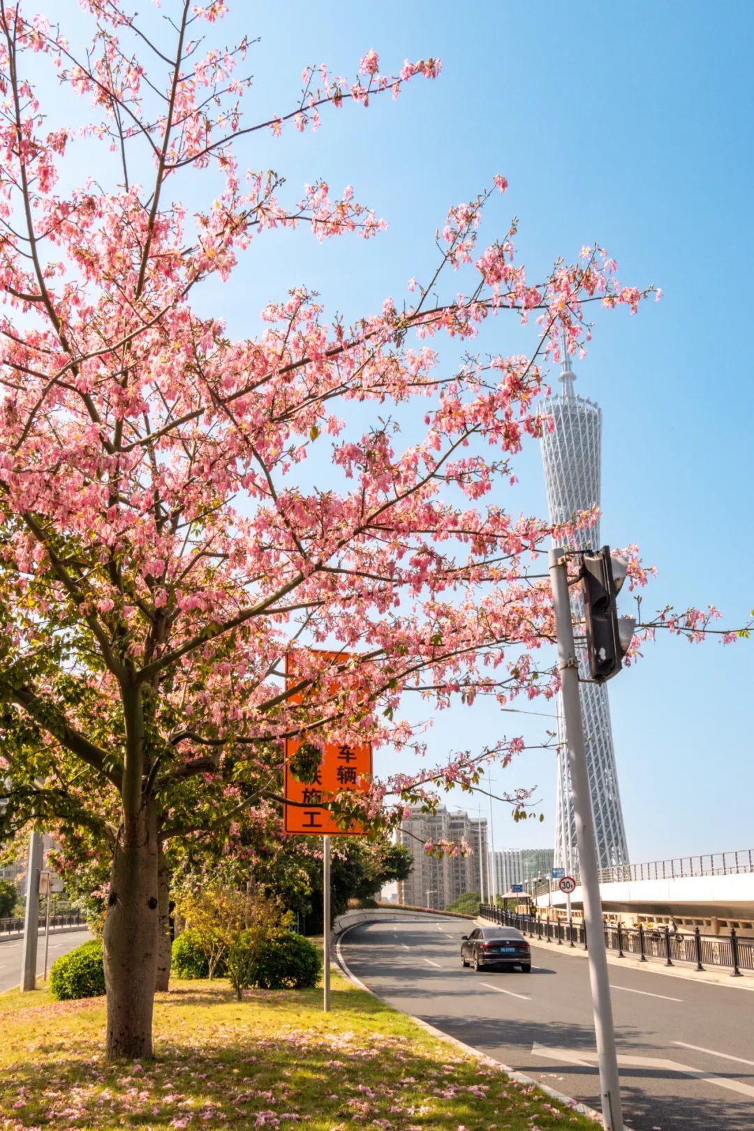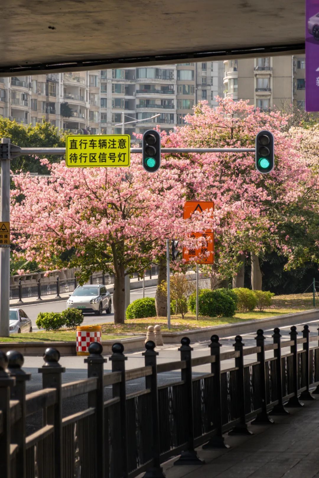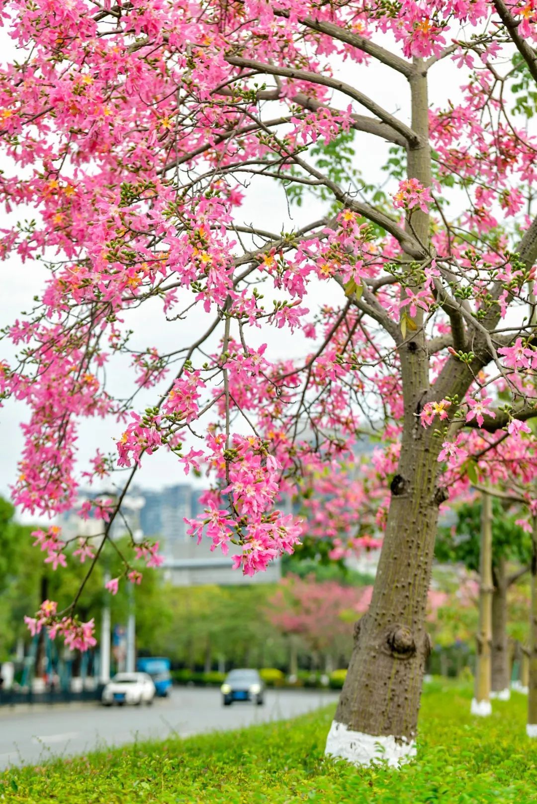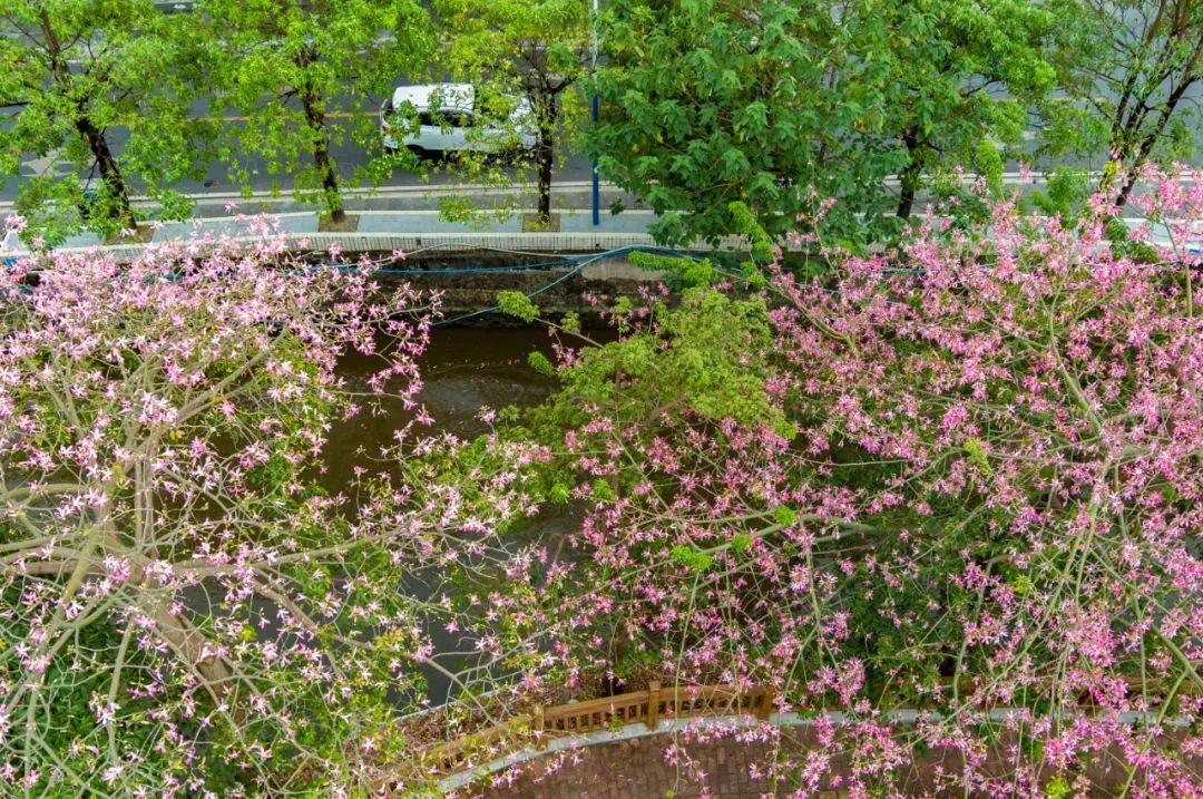▲天河区深涌旁的美丽异木棉也悉数绽放,车辆从满树繁花下驶过像一幅风景画。(摄影|杨耀烨)