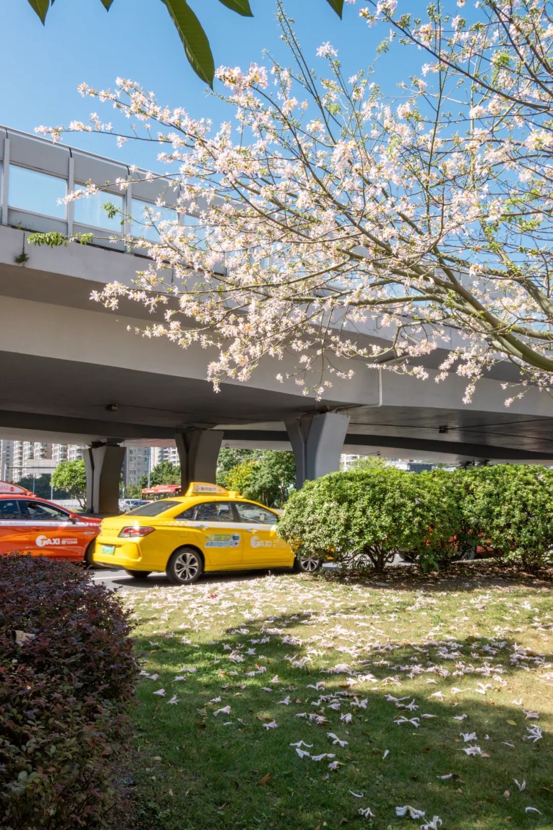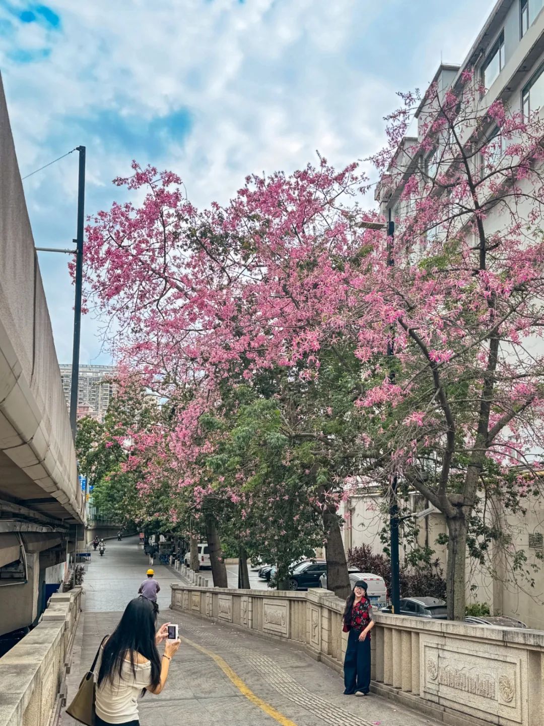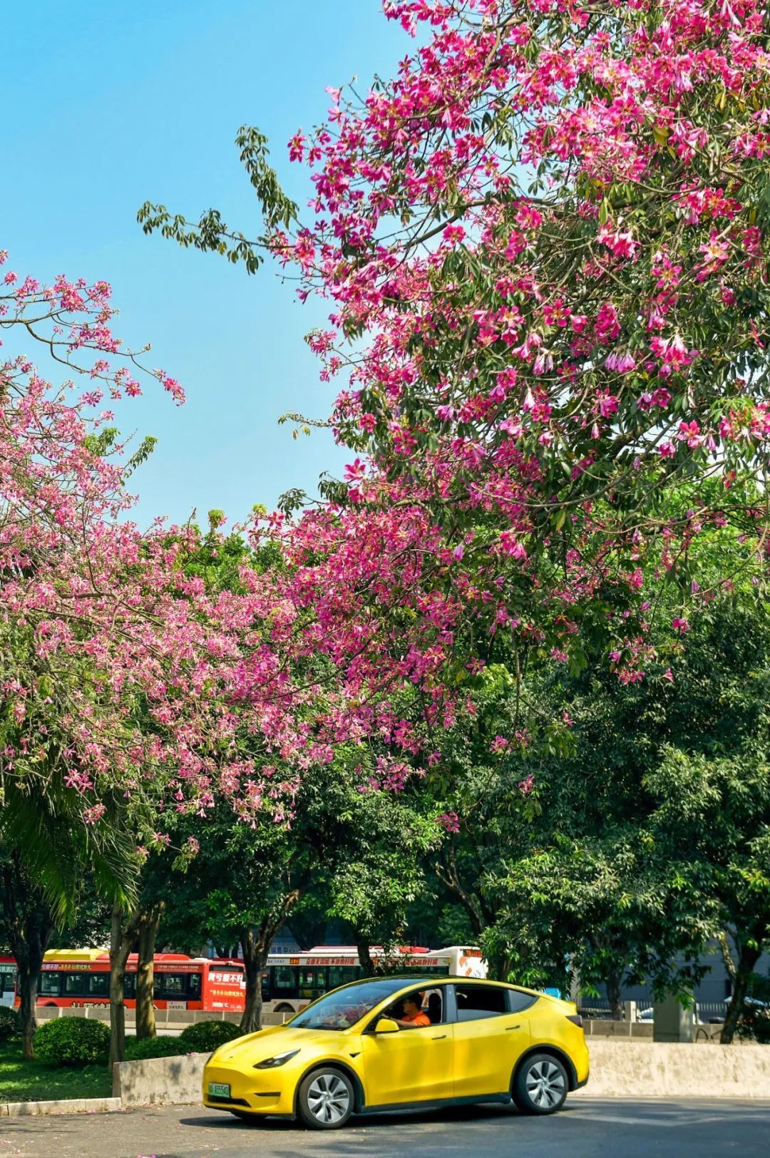 ▲天河区深涌旁的美丽异木棉也悉数绽放,车辆从满树繁花下驶过像一幅风景画。(摄影|杨耀烨)