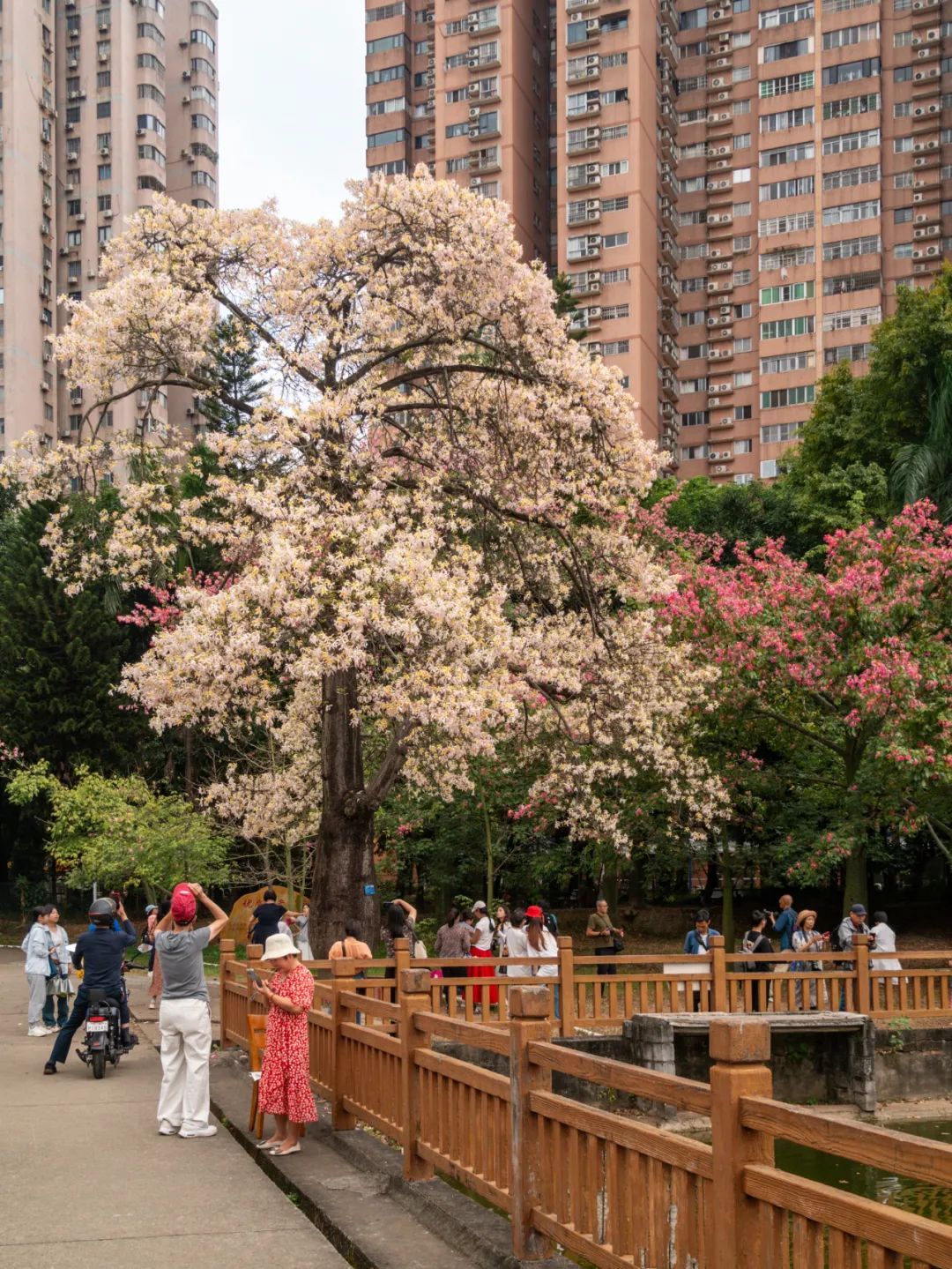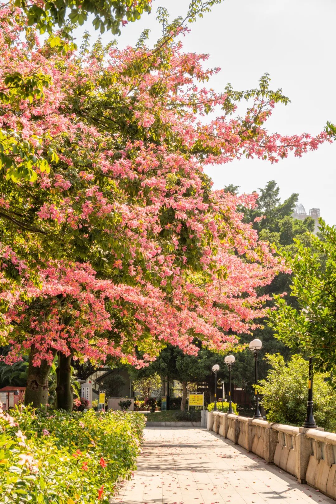 ▲▼ 海珠区党建公园内,美丽异木棉开成了一条“花路”。(摄影|刘宇 )