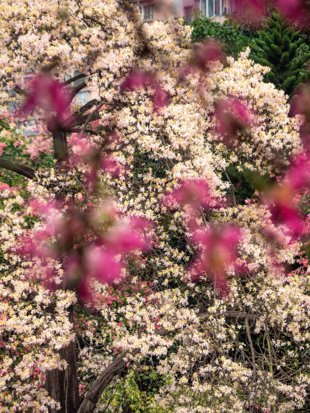 花树粉嫩而柔美,建筑刚强有线条,一框画面之中刚柔相济。(摄影|吴子良)