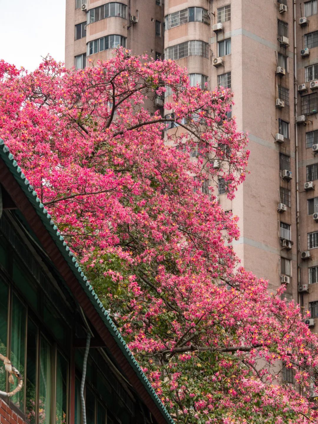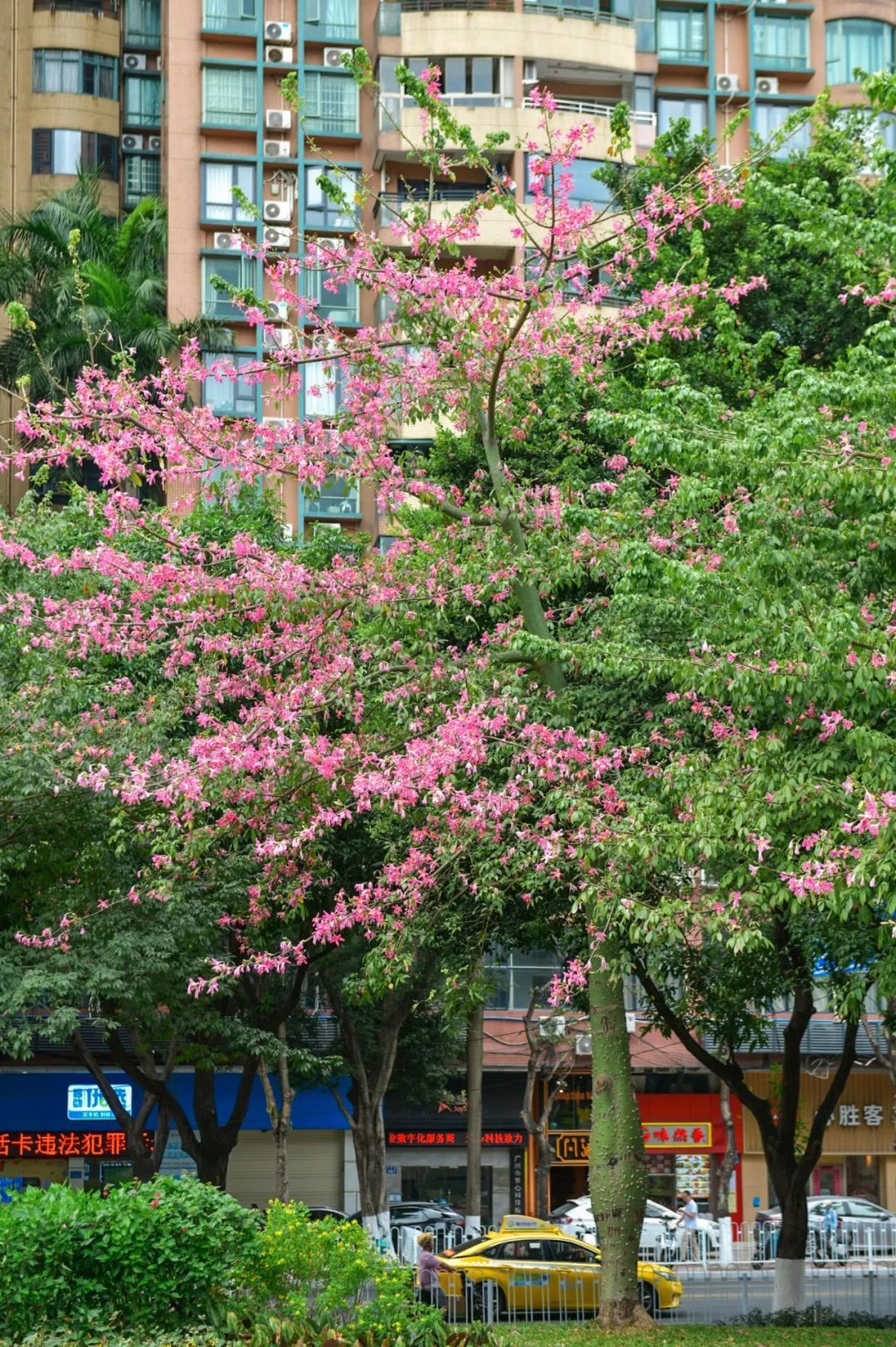 天府路旁的居民开窗即可赏看花景,行人从盛开的美丽异木棉花下走过,时常被花开胜景吸引目光,驻足观赏。
