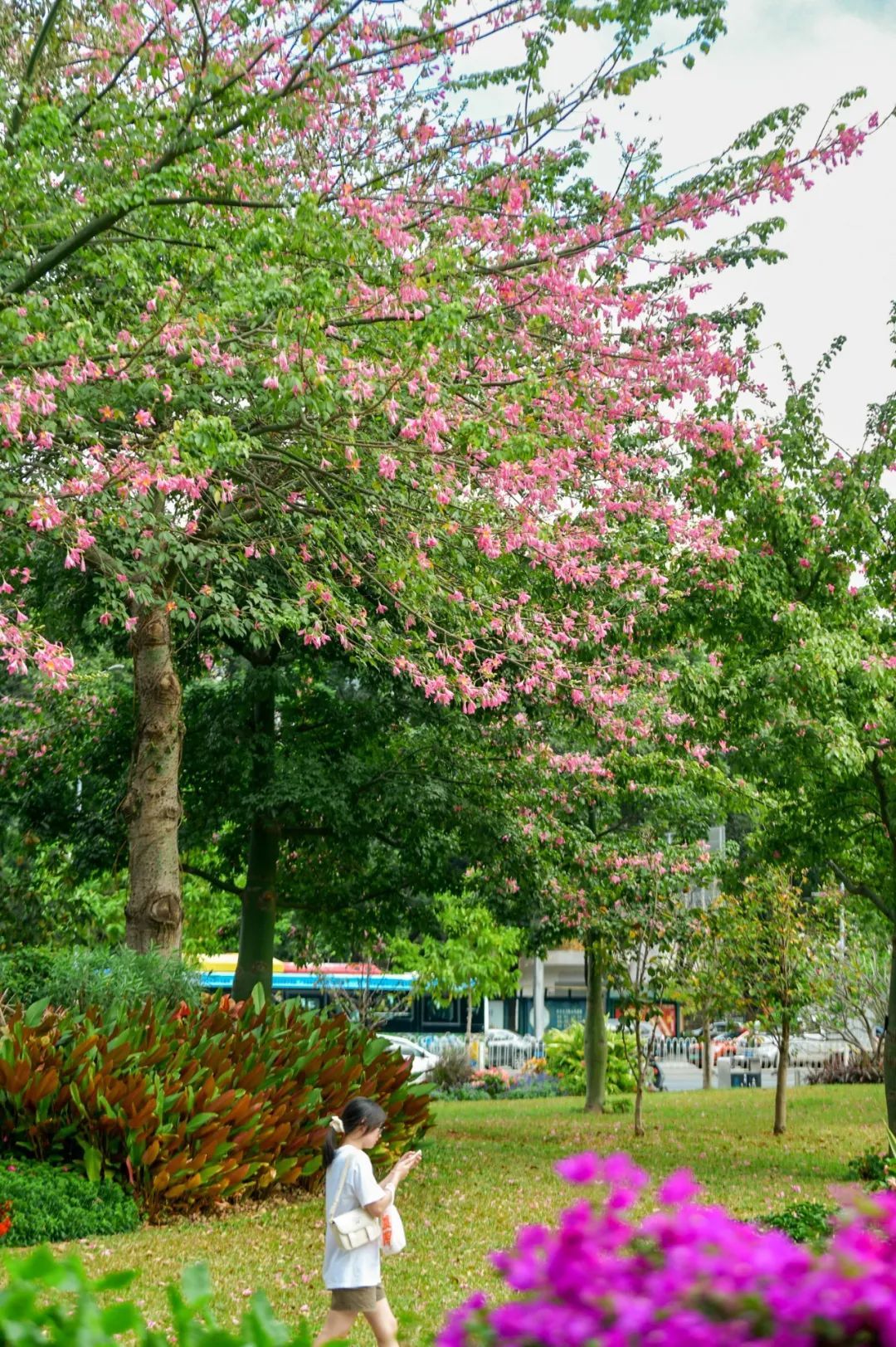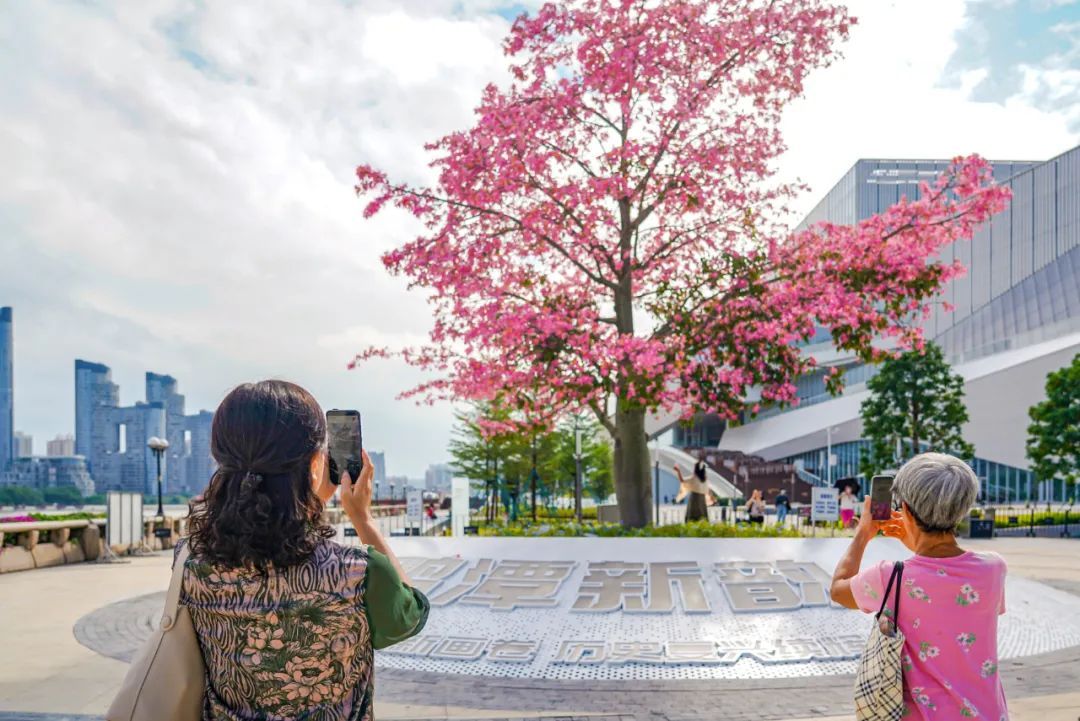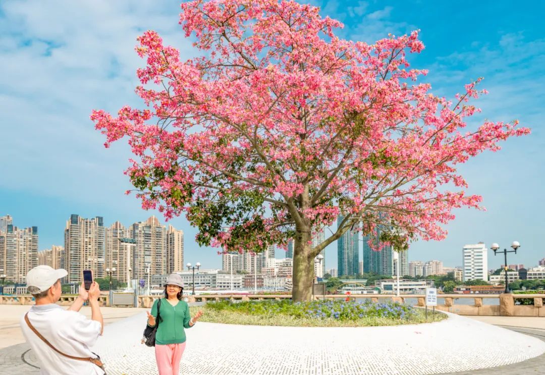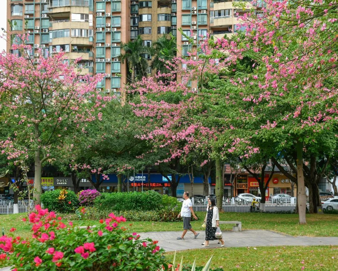 在南沙,漫步街头如同进入粉色花海,与旁边的楼房、绿树构成了和谐的自然画卷,随手一拍就是好看照片。