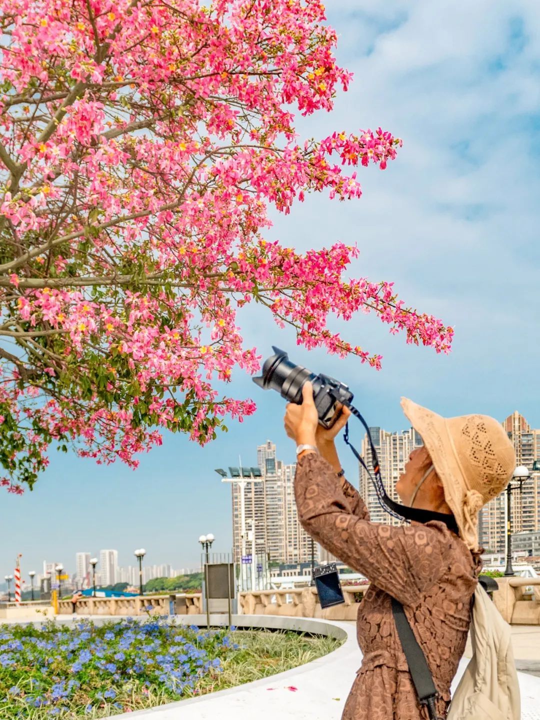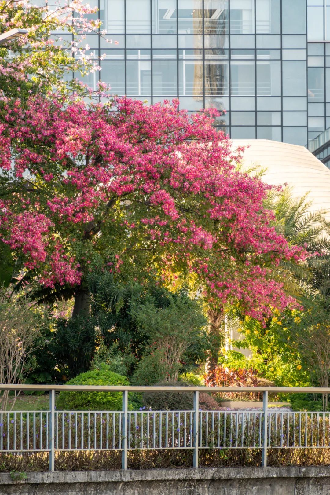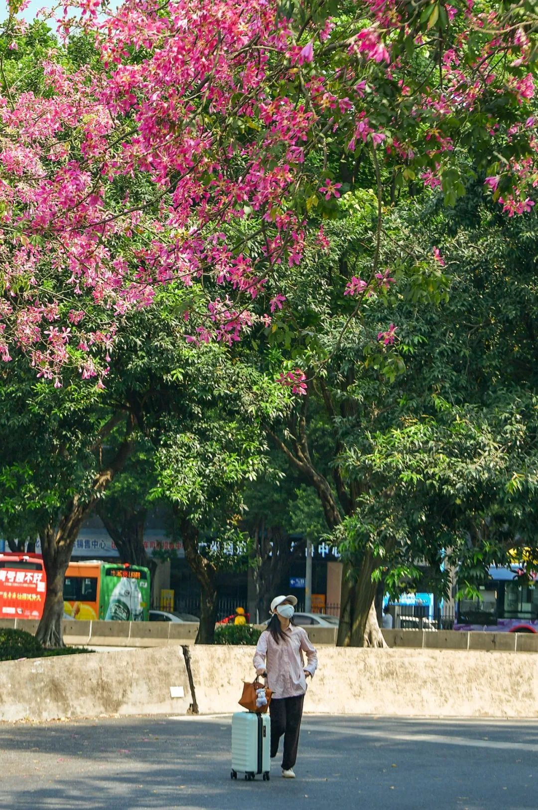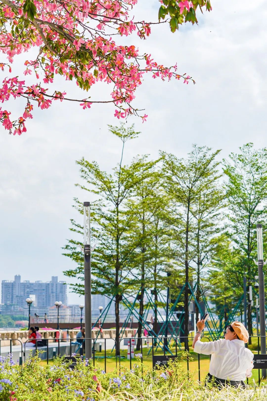 在南沙,漫步街头如同进入粉色花海,与旁边的楼房、绿树构成了和谐的自然画卷,随手一拍就是好看照片。