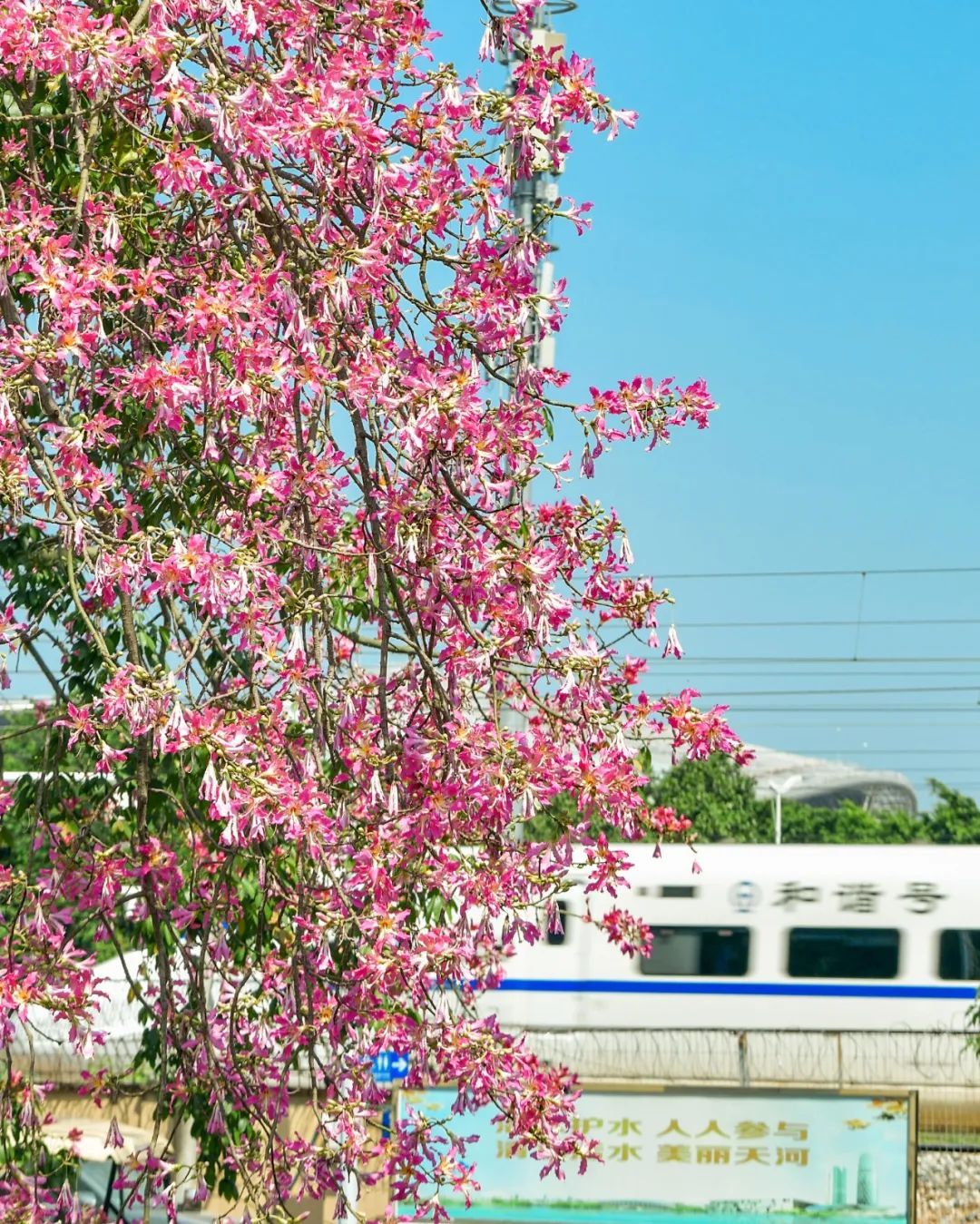 天河区黄村育英路河涌边有一排美丽异木棉,近期花开正艳,时不时还有高铁列车从开满花的美丽异木棉旁边穿梭而过。(本组摄影|杨耀烨)