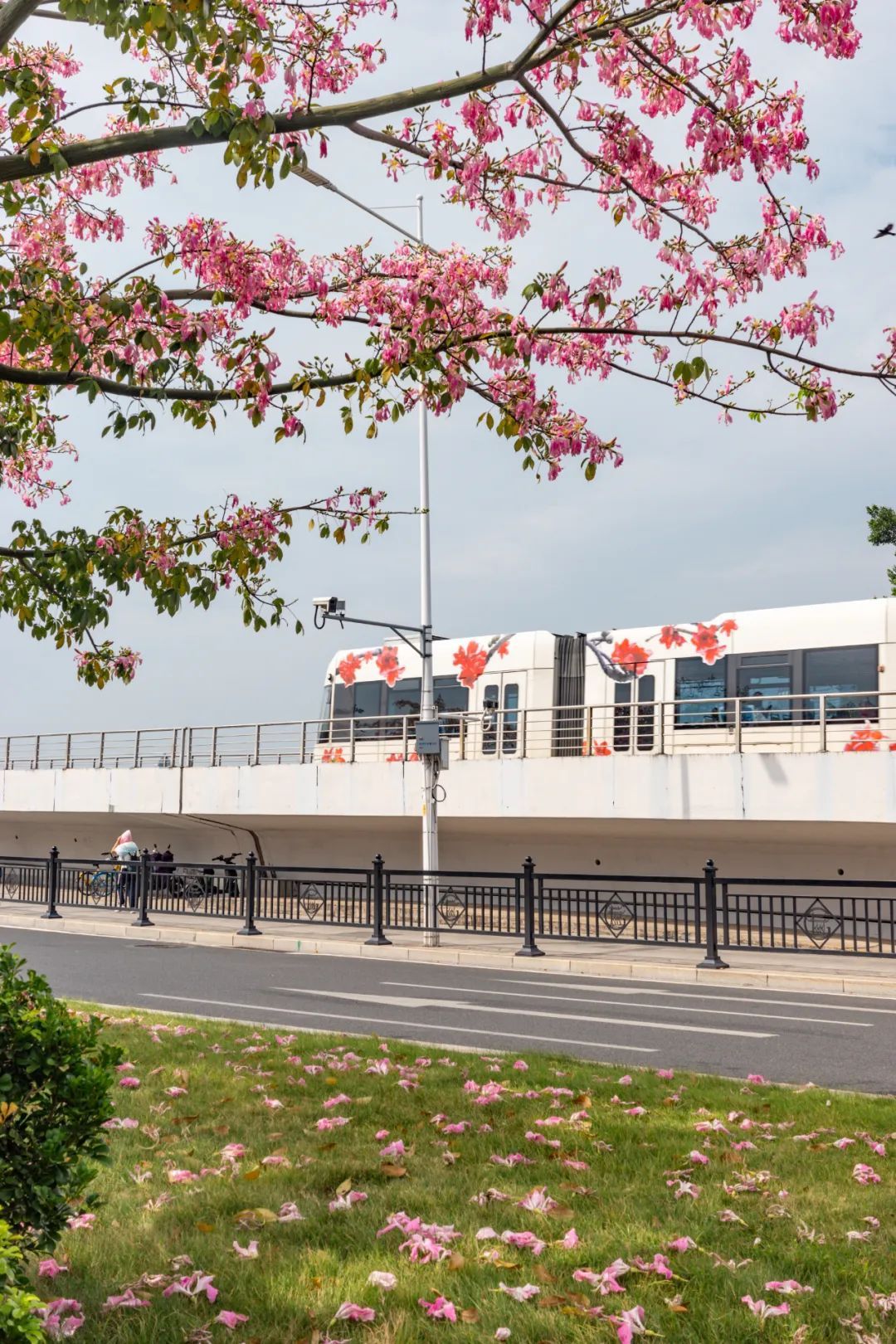 阅江西路的美丽异木棉花今年开得特别“小清新”,不仅仅是因为花开得繁茂,而且还得益于持续很长一段时间的晴朗天气,以及这里时不时经过的海珠有轨电车一号线的列车。(本组摄影|刘宇)