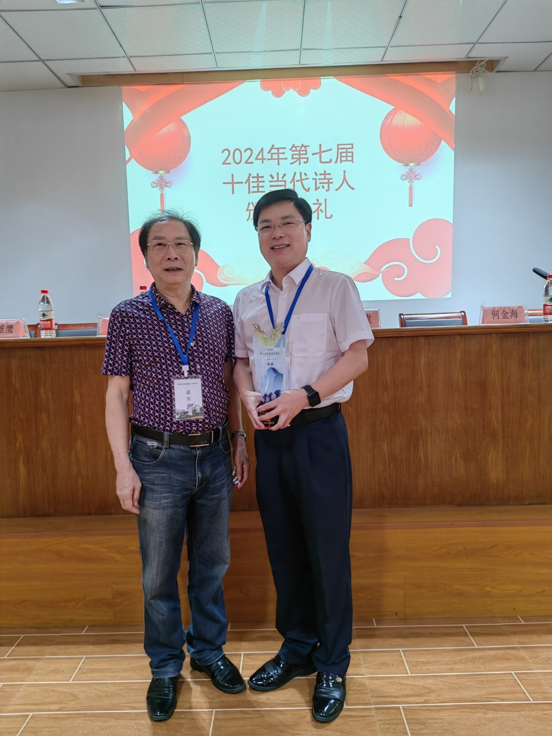 在第七届全国“十佳当代诗人”颁奖礼上,谢雄鹰作为颁奖嘉宾在台上为外甥谢骥颁奖