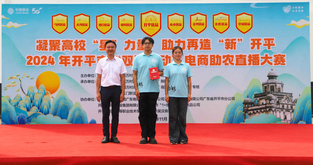 近日,由开平市“百县千镇万村高质量发展工程”指挥部主办的2024年开平市“双百行动”电商助农直播大赛落幕。此次大赛主题为“凝聚高校‘星’力量,助力再造‘新’开平”,江门职业技术学院(下称“江门职院”)与广州航海学院积极筹备此次大赛,最终荣获赛事优秀组织奖,参赛队伍共荣获全场唯一的“最佳直播奖”1项,一等奖1项,二等奖1项,三等奖2项,优秀奖6项。