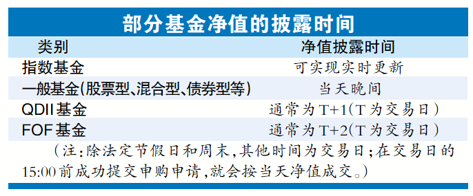 对投资者而言,在交易日的15:00前成功提交申购申请,会按照当天的净值成交。但是,记者查看各大平台发现,各平台上显示的基金净值均是前一日的净值,普通基金当日净值是在收盘后晚间公布。