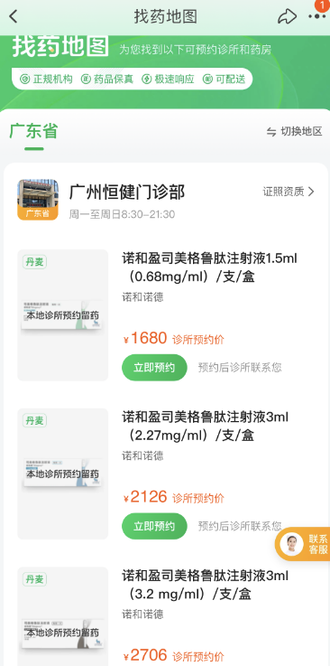 在另一App搜索“诺和盈”关键词,会自动跳转至找药地图,目前广东省显示有1家位于天河区的门诊部可以预约留药,页面显示首批限量,有0.25、1.7、2.4三个剂量,诊所诊疗并核销后配药发药,可以送药到家,也可以到诊所自提。