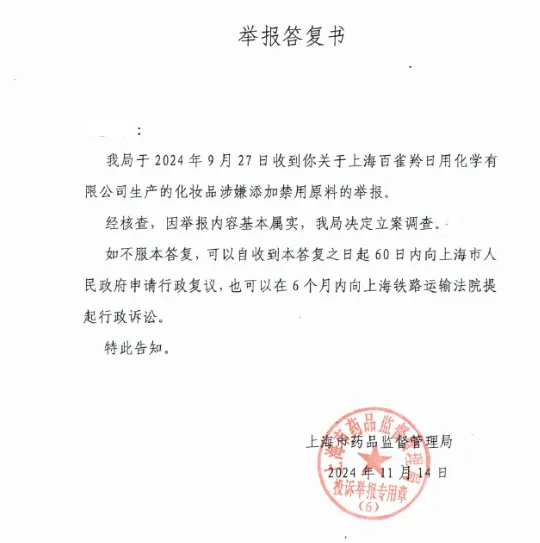 此前,有网友晒出一张上海市药监局11月14日发出的举报答复书,称关于上海百雀羚日用化学有限公司生产的化妆品涉嫌添加禁用原料的举报经核查,内容基本属实,决定立案调查。