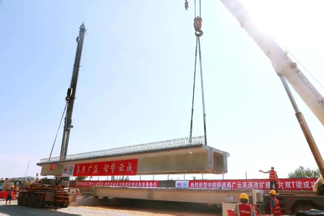 近日,广云高速改扩建项目大朗特大桥首片预制梁板顺利完成架设,标志着项目全面进入桥梁上部结构施工阶段。大朗特大桥是项目的控制性工程,全长1305米,共设计20米T梁390片。架设的T梁自重64.2吨,采用梁板双机抬吊方式进行架设,架设用时约1小时。