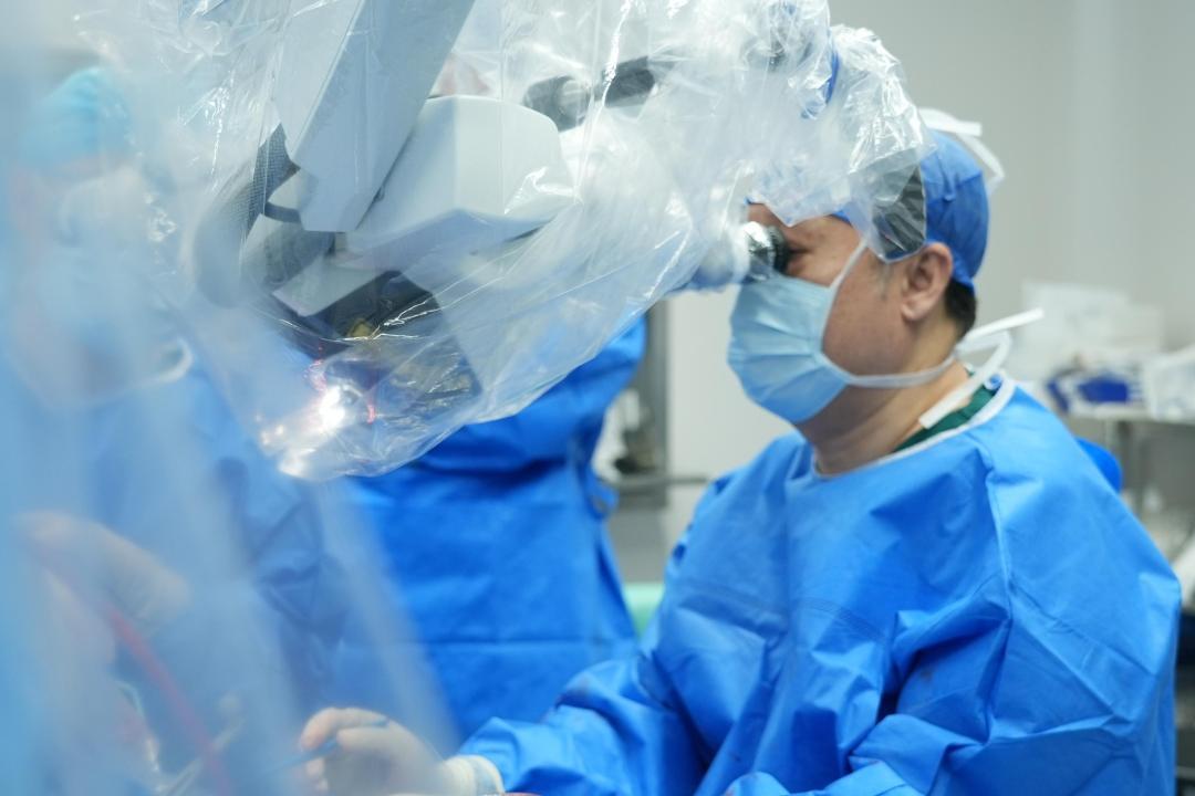 该手术的挑战性在于,不仅需要在脑内精准探测病灶,还要同时确定大脑功能区位置并给予保护,避免术中损伤功能区。这就要求患者必须在术中从全麻状态中被唤醒,转为局麻,在清醒的状态下,配合医生指令做出相应动作和言语交流,从而确定医生所寻区域是大脑功能区还是病灶。
