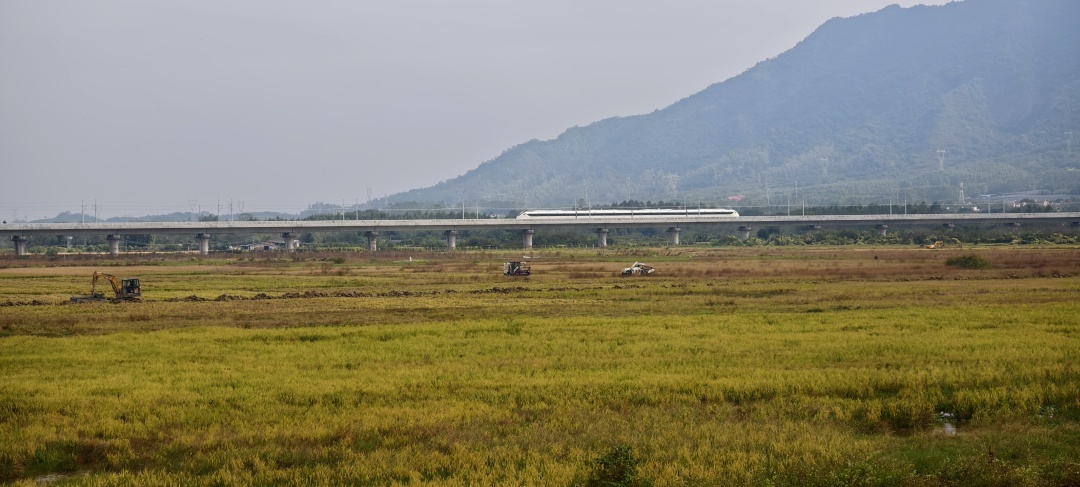正当游人沉浸在这如诗如画的美景中时,一阵呼啸声从远处传来。循声望去,只见一列高铁如银色的巨龙般从田野的高架桥上飞驰而过。高铁的速度极快,眨眼间便消失在远方的天际。远处的峡山巍峨耸立,与飞驰的高铁相互映衬,如此难得的同框画面理所当然成为人们追捧的朋友圈“凡尔晒”。在这一刻,古老与现代、宁静与喧嚣完美地融合在一起,让人感叹岁月的变迁与时代的进步。