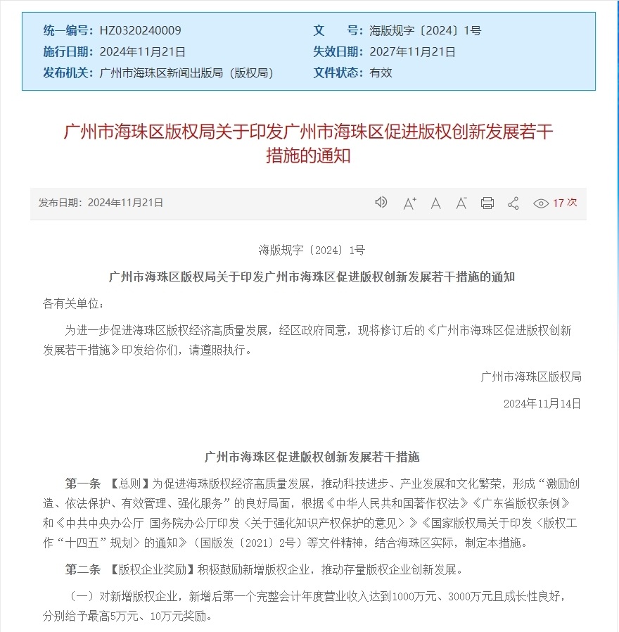 日前,广州市海珠区版权扶持政策《广州市海珠区促进版权创新发展若干措施》(也称“版权十条”)升级2.0版正式发布。新修订的政策简化了申报条件,优化了奖励等级,进一步降低了企业申报门槛,支持中小版权企业发展,鼓励企业开拓海外市场,传播中华文化。