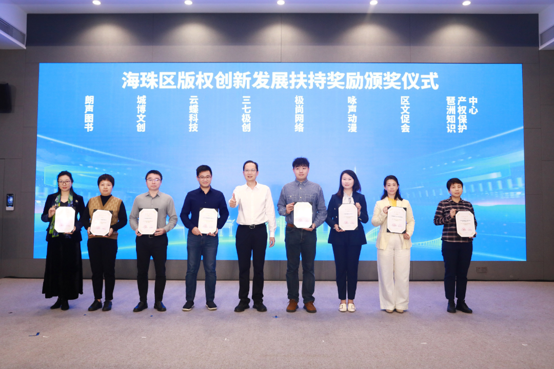 除了版权政策,海珠区还积极构建版权创造、运用、保护、管理全链条服务体系。实施“引才引智”行动,鼓励企业引进国际国内动漫游戏、网络直播等领域人才和优秀创新创业团队落户海珠。2023年,奖励极尚网络等企业30万元人才扶持专项资金。完善版权管理运用,打击侵权盗版,支持企业、园区健全版权保护制度,使用正版软件,打造了3家全国版权示范单位(园区)、5家省级版权示范单位(园区)。优化版权服务,建设会展与数字经济、动漫游戏、出版发行3个版权服务工作站,常态化提供版权登记、宣传培训、纠纷调处等便民利企服务。