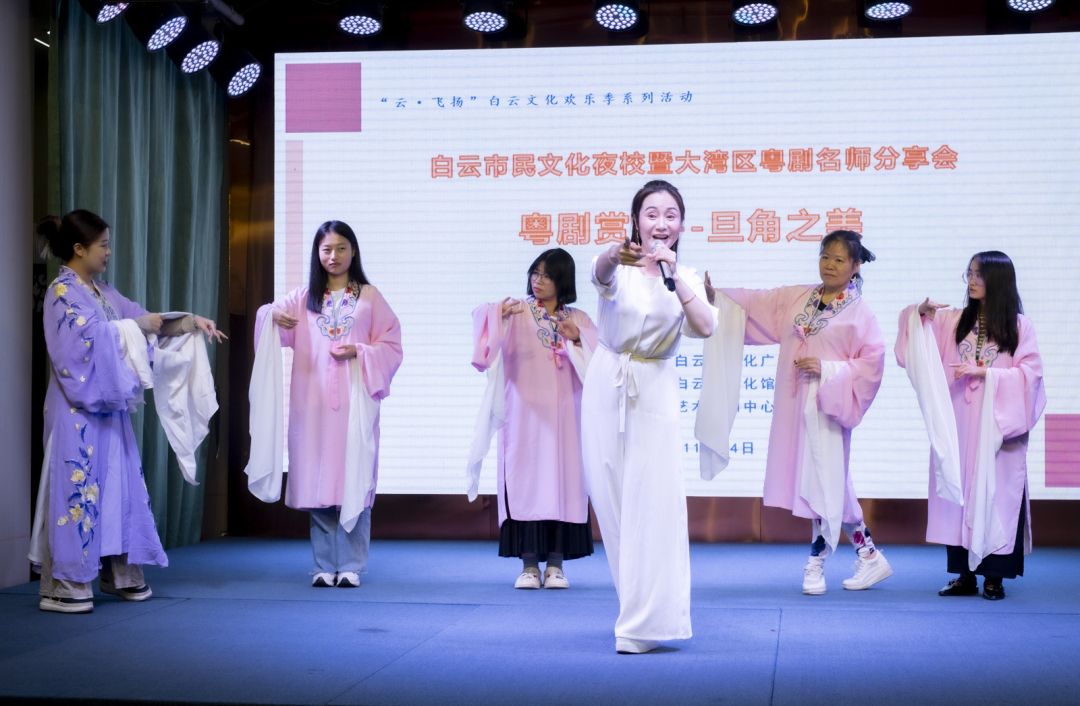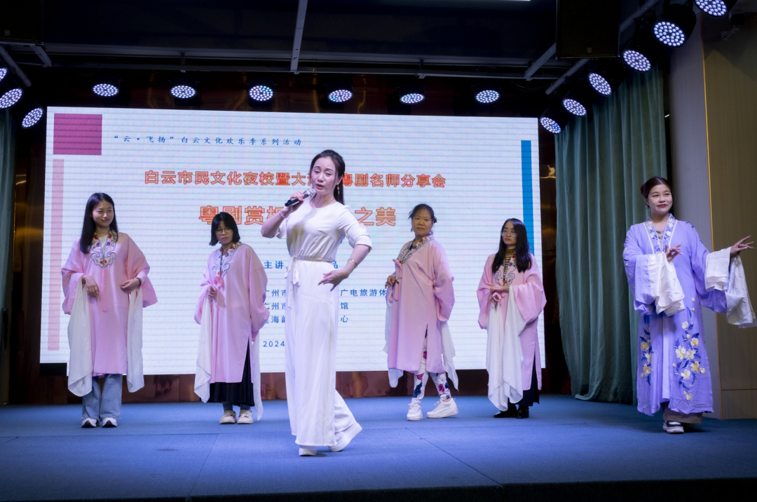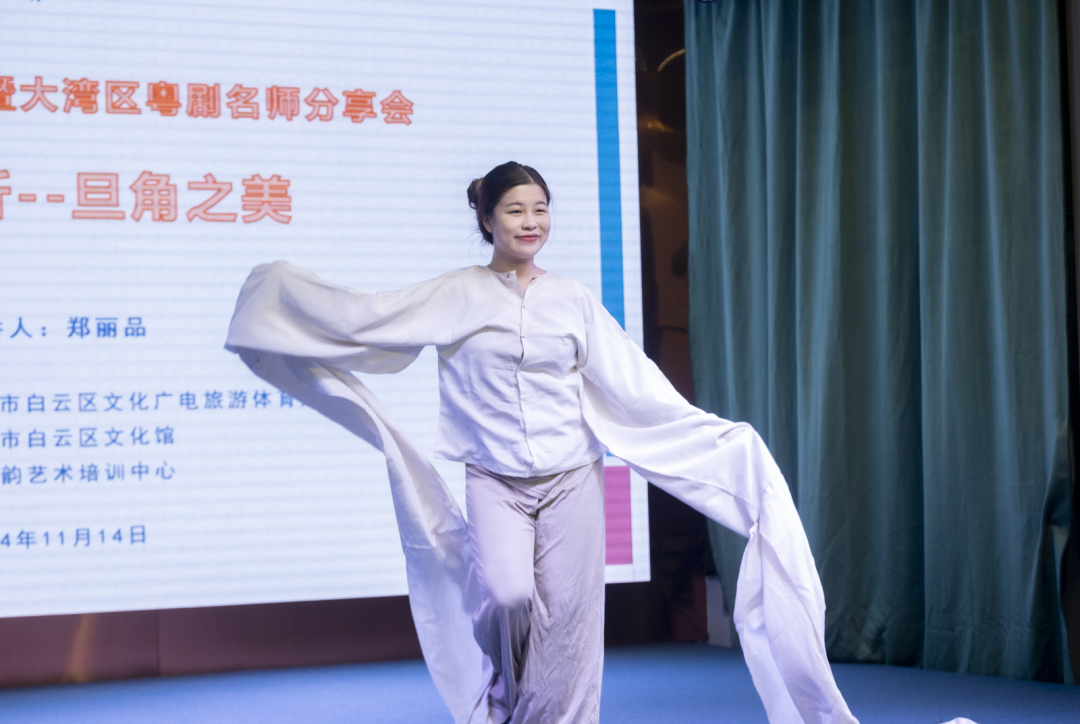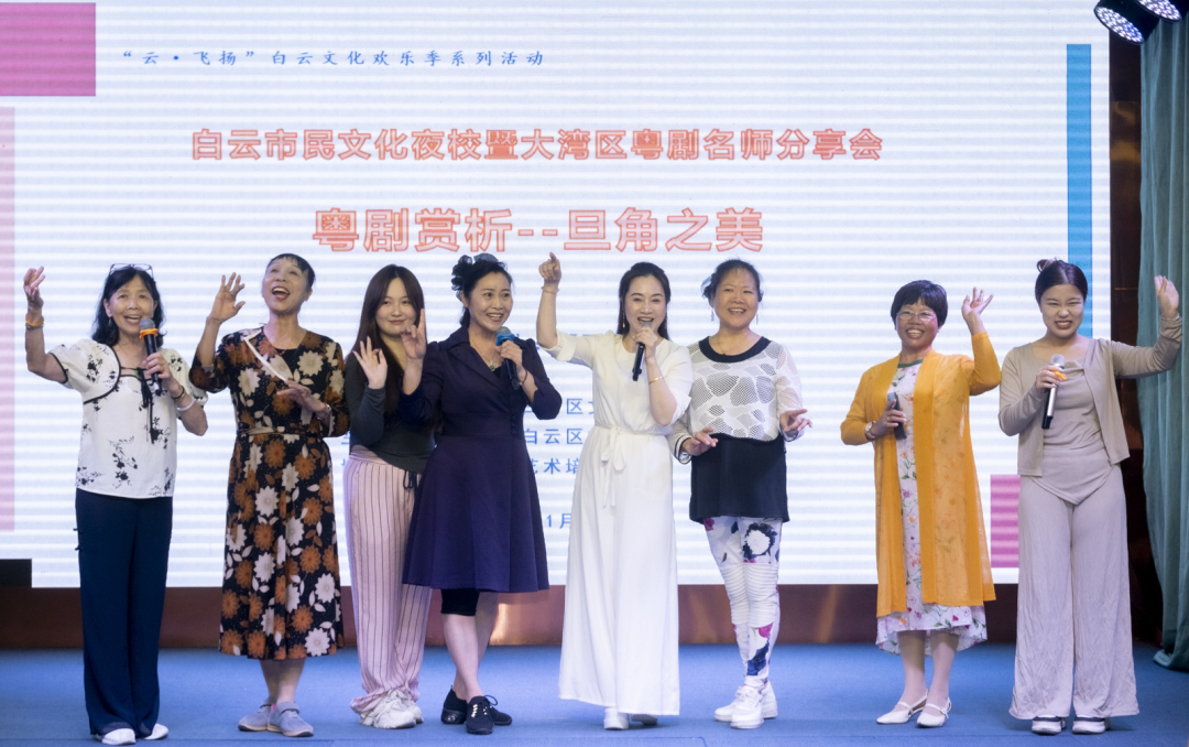 日前,广州白云市民文化夜校之名师大讲堂系列活动品味国风在白云区文化馆透明艺术空间开讲,著名粤剧表演艺术家郑丽品带着大湾区粤剧弟子,以“粤剧赏析——旦角之美”为主题,为大家进行现场分享授课。台下,一众粤剧艺术爱好者听得津津有味,积极上台体验粤剧基本功。