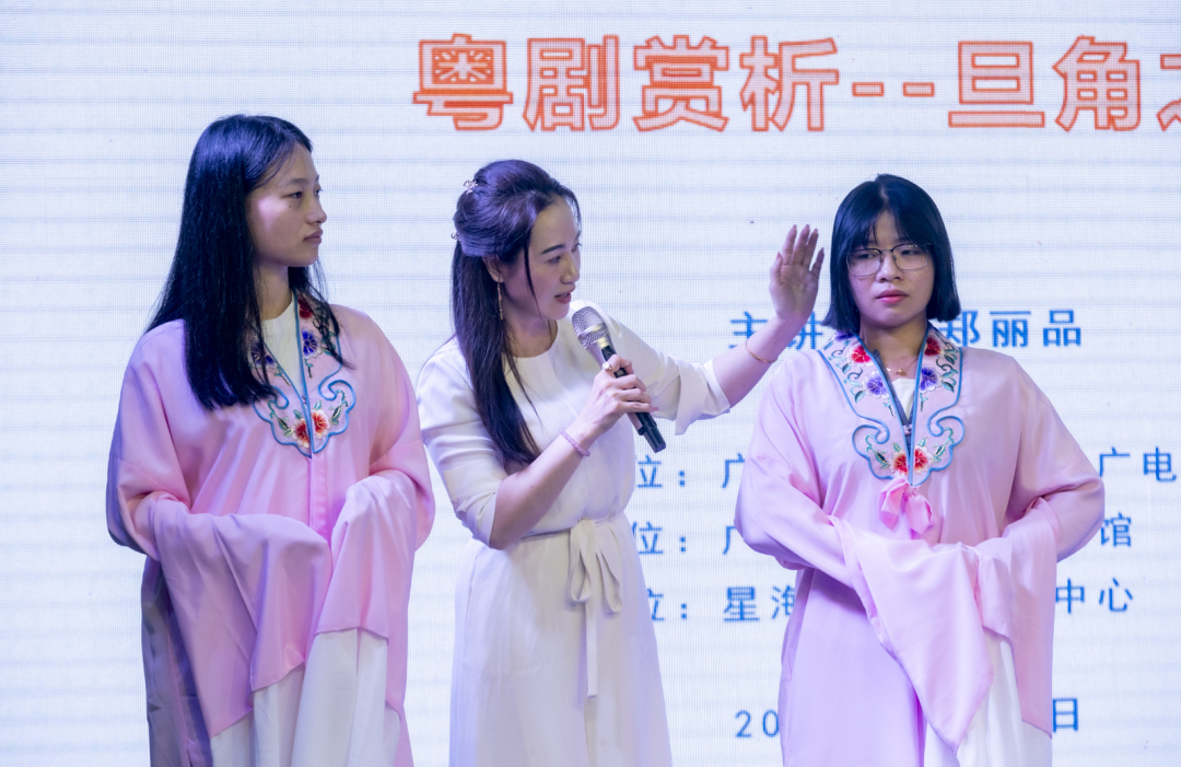 当天的讲座中,郑丽品给学员们讲解了粤剧的基础知识,重点介绍了林黛玉、穆桂英、佘太君、春兰等四个不同行当的旦角表演,从人物形象、表演、唱法、身段等,展示每个人物年龄、身份、性格的不同演绎。