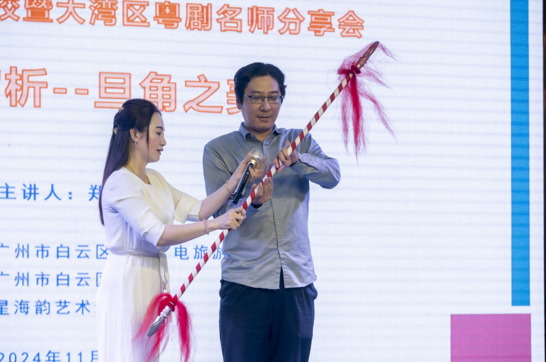 现场最热闹的要数互动体验环节。数位学员积极上台,在郑丽品及其弟子的指导下,体验舞水袖、耍花枪;师生同台合唱粤剧名曲《荔枝颂》,大家全情投入,深刻体会和感受粤剧之美、传统非遗的魅力。