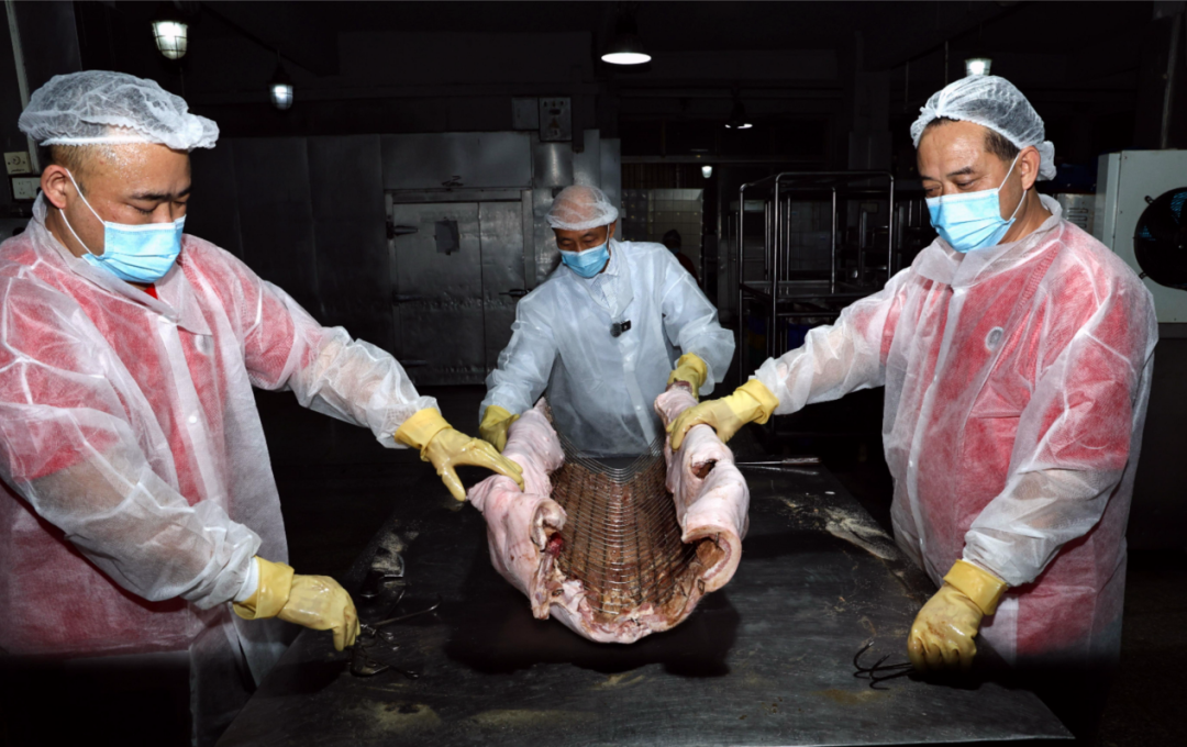 走进生产车间,可以看到工人们正忙碌而有序地操作着。这里实行严格的“零库存”管理,每天根据门店此前订单量精准生产,确保所有烧腊产品均在当天完成制作,最大限度地保留了食材的原汁原味和营养价值。