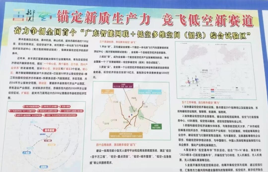 韶关新丰县所处低空空域干净,区位地理环境好,具有发展低空飞行的良好条件,近年来依托广汽南方试验场项目获批50平方公里空域使用范围,提出“一个核心区、两个基地、三个园、四大产业体系”的发展格局,在县一级率先启动低空经济产业发展专项规划,建成全省第一个县域低空经济总部基地。