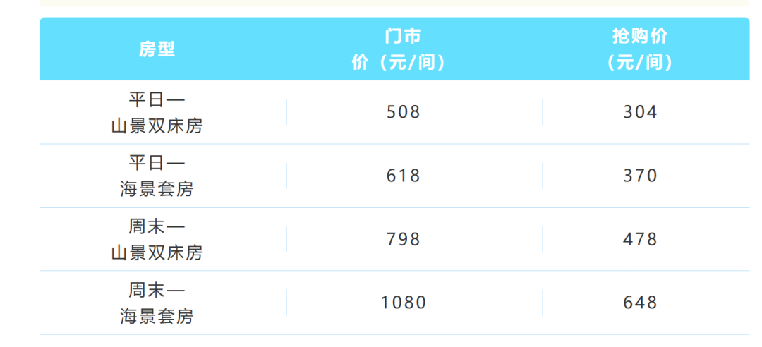 ②此套餐房型为山景双床房,可升级至海景套房(大床房),条件为:周日—周四加收110元/套,周五、周六加收282元/套;