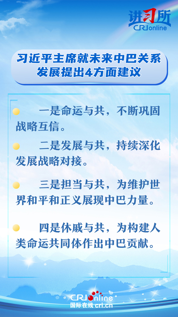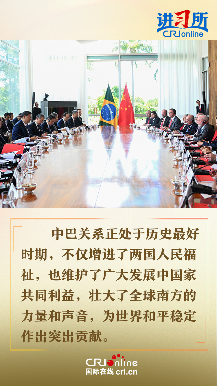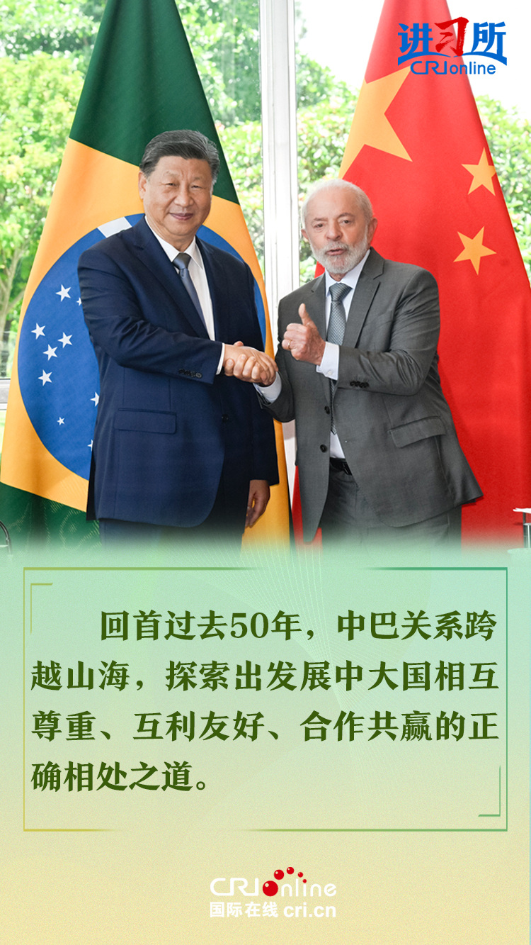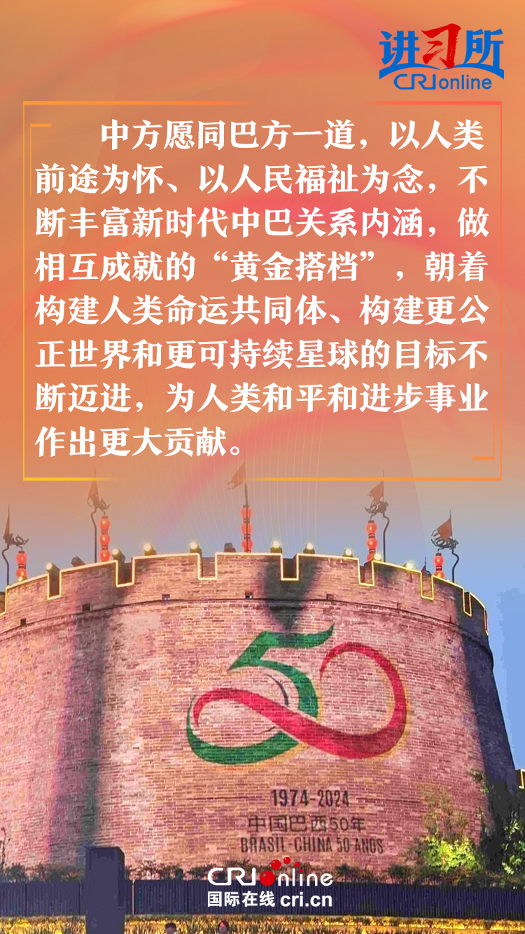 今年是中巴建交50周年。习近平指出,回首过去50年,中巴关系跨越山海,探索出发展中大国相互尊重、互利友好、合作共赢的正确相处之道。中方愿同巴方一道,以人类前途为怀、以人民福祉为念,不断丰富新时代中巴关系内涵,做相互成就的“黄金搭档”,朝着构建人类命运共同体、构建更公正世界和更可持续星球的目标不断迈进,为人类和平和进步事业作出更大贡献。