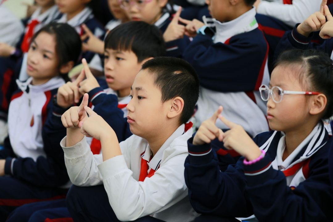 听障儿童与华阳学生一起学习手语,共同用手语表达“激情全运会,活力大湾区”的十五运会口号,以及“追梦大湾区,出彩人生路”的残特奥会口号。