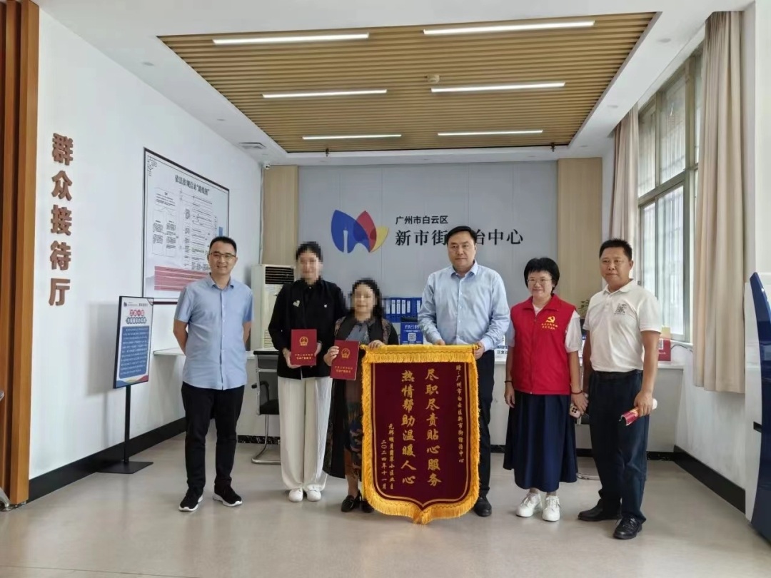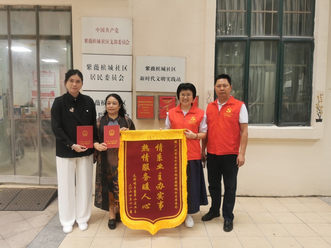 “四年了,终于拿到房产证!感谢街道、居委会各位工作人员为我们解决难题。”近日,广州市白云区元邦明月翡翠小区两位业主代表向新市街平安法治办及紫薇槟城社区工作人员送来锦旗,以感谢新市街工作人员们为小区居民解决不动产权证办理难题。据了解,今年8-11月,新市街已成功为111户业主办理不动产证,剩余几户正在办理中。