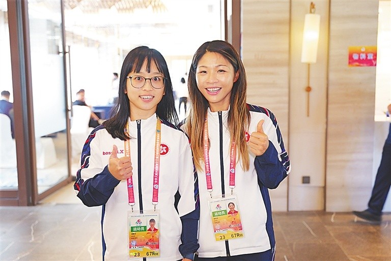香港代表团龙舟项目运动员黄羲汶(左)、蔡菲玉(右)。海报集团全媒体记者 谢式伟 摄
